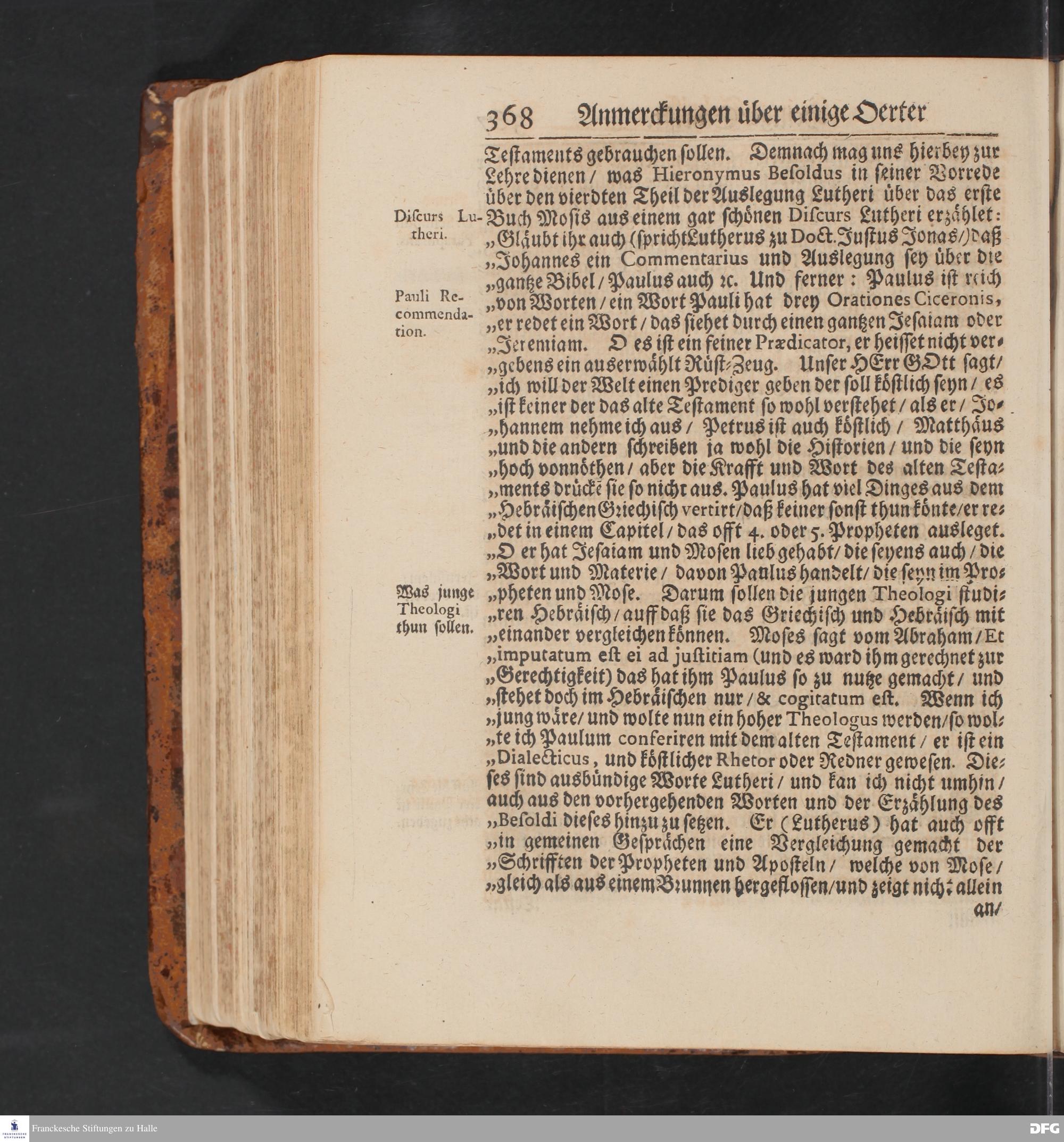 August Hermann Franckens S.Theol.Prof.& Past.Glauch. OBSERVATIONES BIBLICÆ, Oder Anmerckungen über einige Oerter Heil. Schrifft / Darinnen die Teutsche Ubersetzung des Sel.Lutheri gegen den Original-Text gehalten und bescheidentlich gezeiget wird / Wo man dem eigentlichen Wort=Verstande näher kommen könne / Solches auch Zur Erbauung in der Christlichen Lehre angewendet / und im Gebet appliciret wird Vorhin Monat=Weise ediret / Und nun auffs neue durchgesehen.