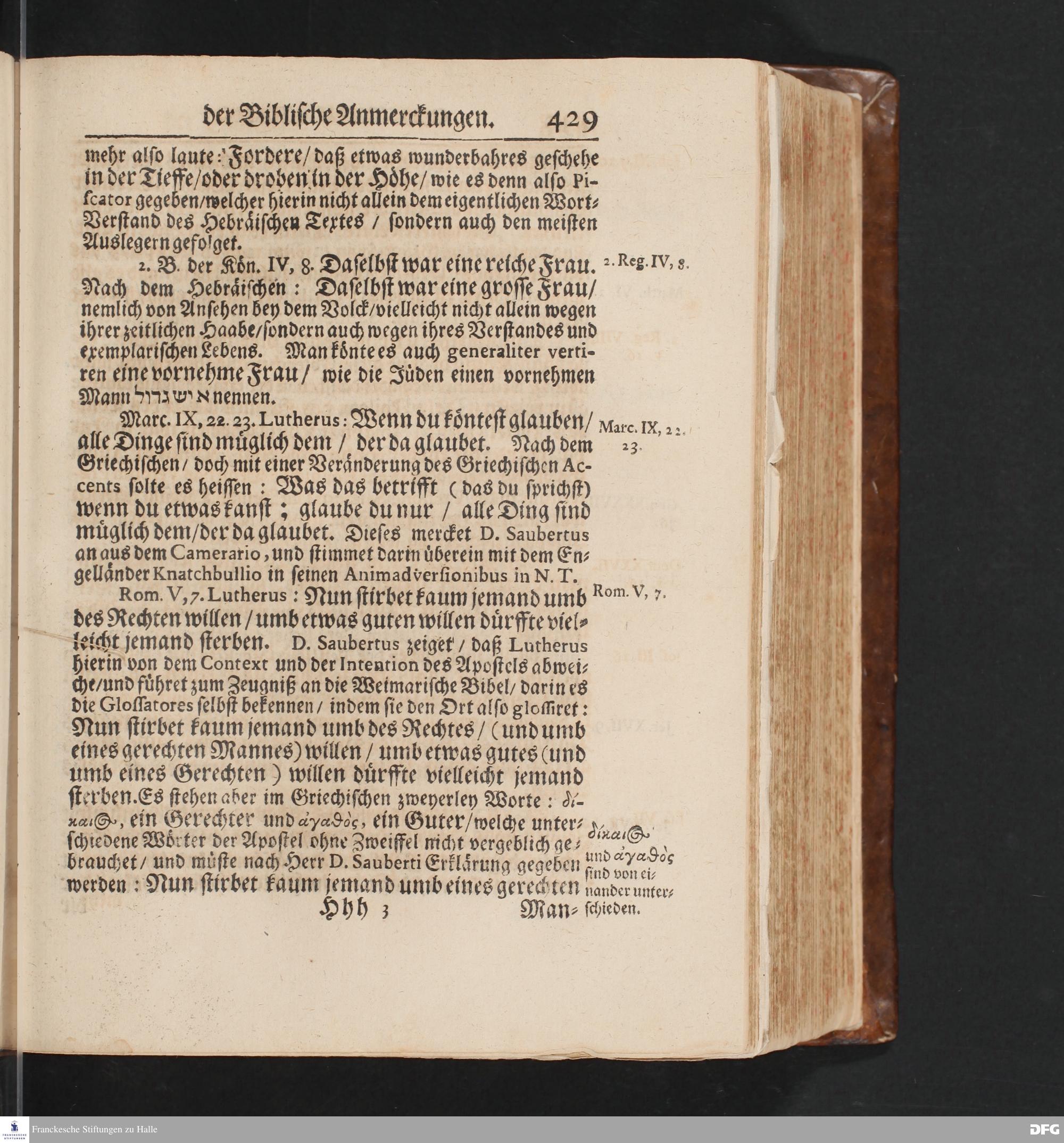 August Hermann Franckens S.Theol.Prof.& Past.Glauch. OBSERVATIONES BIBLICÆ, Oder Anmerckungen über einige Oerter Heil. Schrifft / Darinnen die Teutsche Ubersetzung des Sel.Lutheri gegen den Original-Text gehalten und bescheidentlich gezeiget wird / Wo man dem eigentlichen Wort=Verstande näher kommen könne / Solches auch Zur Erbauung in der Christlichen Lehre angewendet / und im Gebet appliciret wird Vorhin Monat=Weise ediret / Und nun auffs neue durchgesehen.