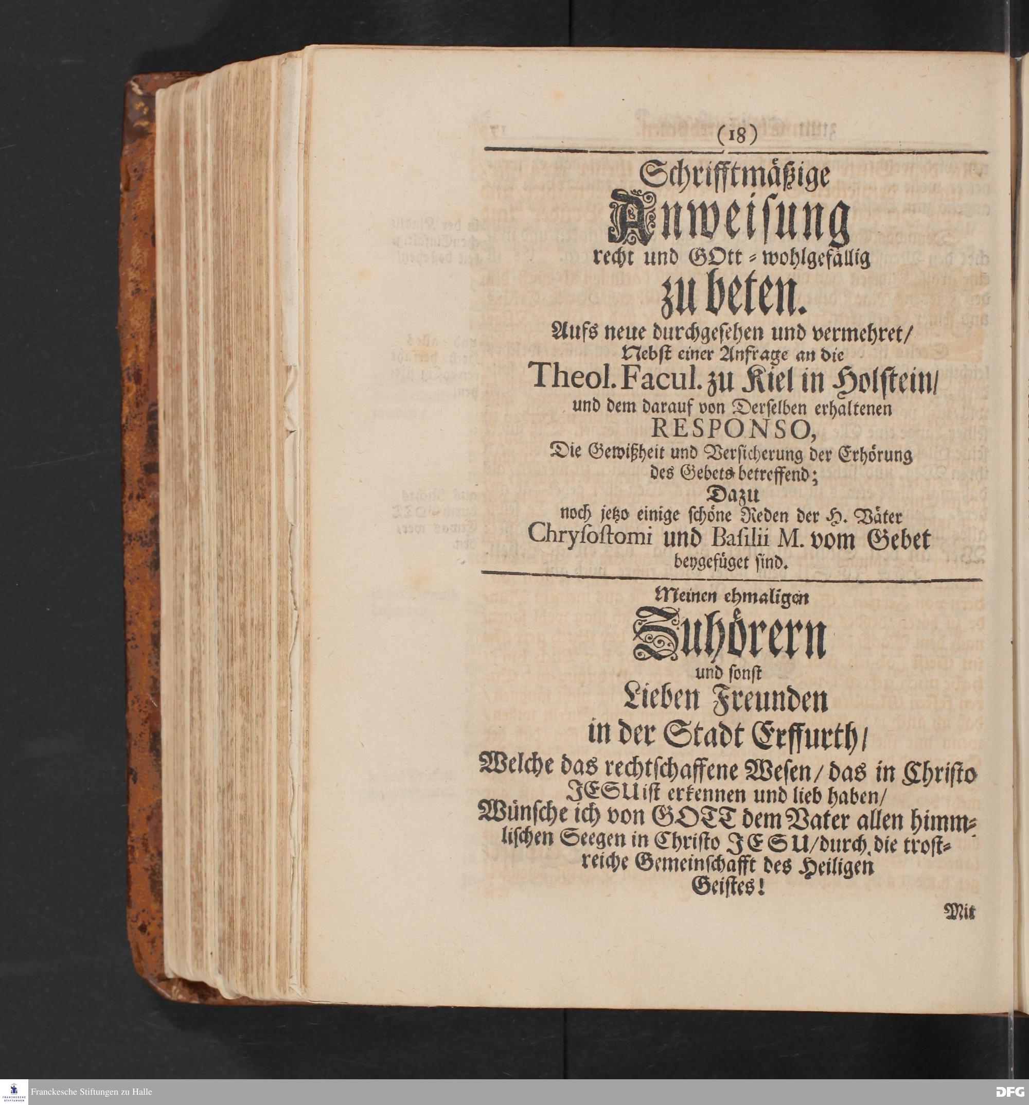 Schrifftmäßige Anweisung recht und Gott-wohlgefällig zu beten. Aufs neue durchgesehen und vermehret, Nebst einer Anfrage an die Theol. Facul. zu Kiel in Holstein/ und dem darauf von Derselben erhaltenen Responso, Die Gewißheit und Versicherung der Erhörung des Gebets betreffend; Dazu noch jetzo einige schöne Reden der H. Väter Chrysostomi und Basilii M. vom Gebet beygefüget sind.