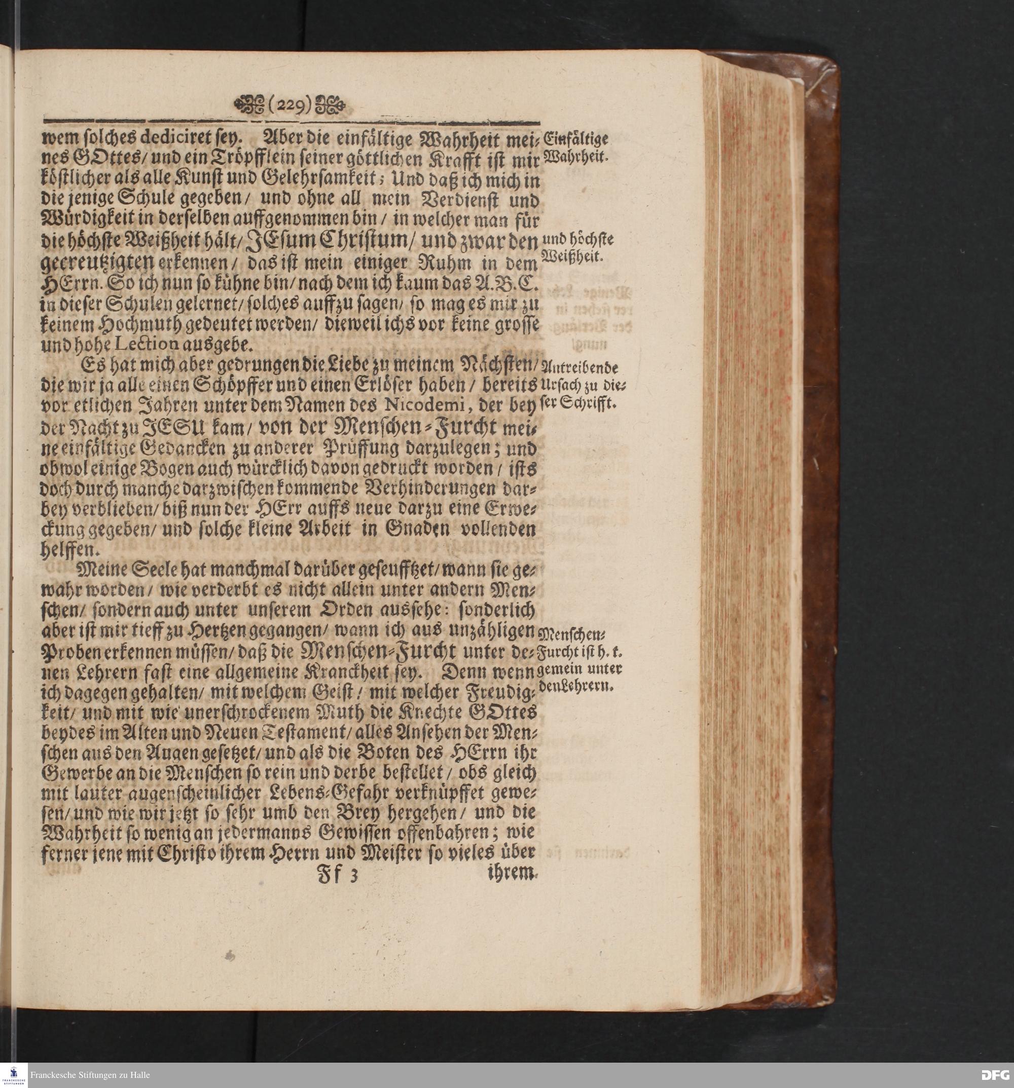 NICODEMUS Oder Tractätlein Von der Menschen=Furcht / Deren Beschreibung / Ursachen / Kennzeichen / Schaden / Bemäntelung / dagegen geordneten Mitteln / und wie zu einem freudigen Glauben zu gelangen / und derselbe weißlich und nützlich zugebrauchen / Zu Pflantzung der wahren Furcht GOttes / In allen Ständen heylsam / besonders aber dem Lehr=Stande dediciret von August Hermann Francken / S.S.Theol.P.Ord.& P.Glauch.