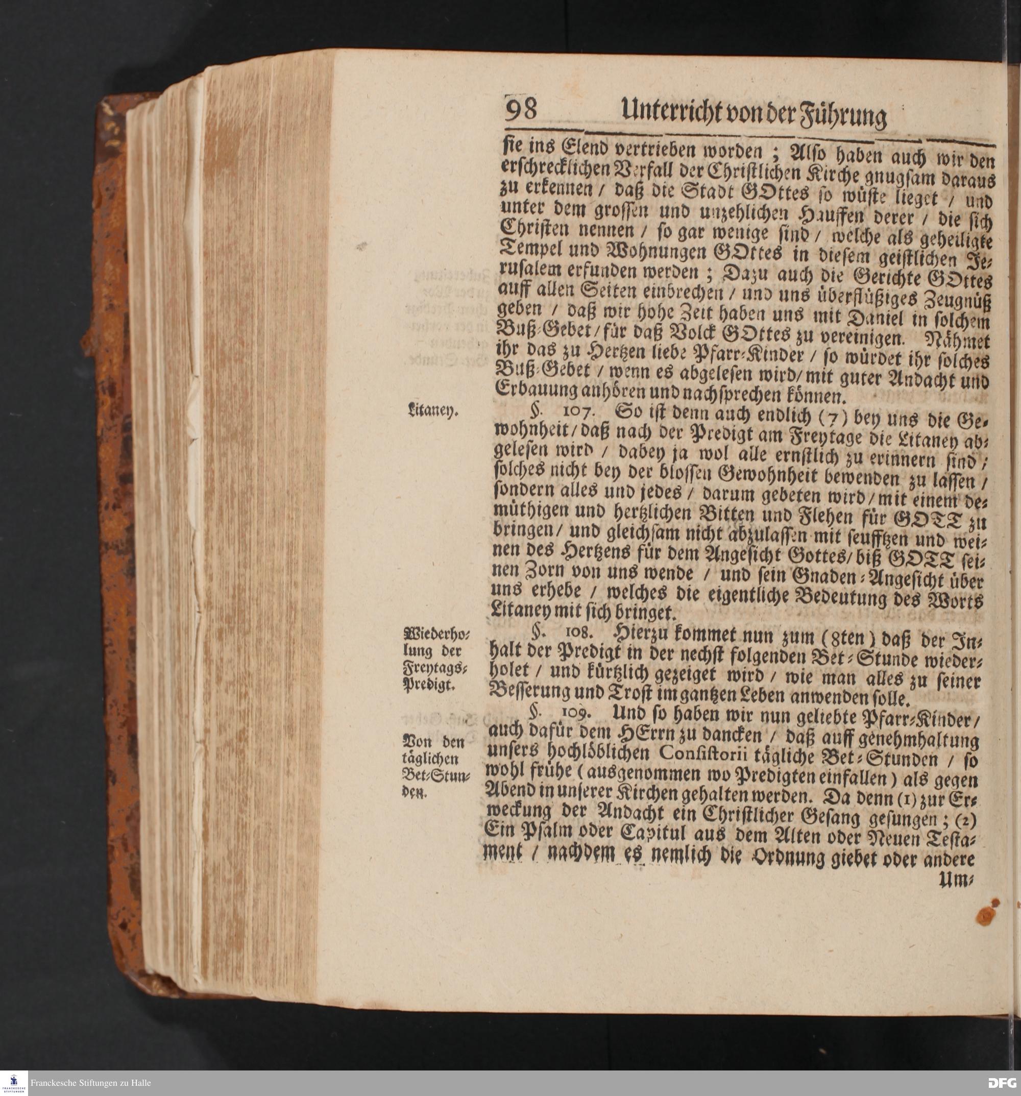 Einfältiger Unterricht Von der Führung des Predig=Amts Und dessen heilsamer Anwendung an Seiten der Zuhörer / Die Heiligung der Sonn= Fest= Apostel= Buß=und Bet=Tage / wie auch der Fasten=Zeit / die Wiederholung der Predigten / Catechisation, Wochen=Predigten / Betstunden / und insgemein die Handlung des Göttlichen Worts betreffend / Ehedessen unter dem Titul Des Glauchischen Gedenck=Büchleins Auff den Zustand Der Gemeinde zu Glauche an Halle / Wie sich derselbe Anno 1693.befunden / gerichtet von August Hermann Francken / S.Theol.Prof.Ord.& Past.Glauch.