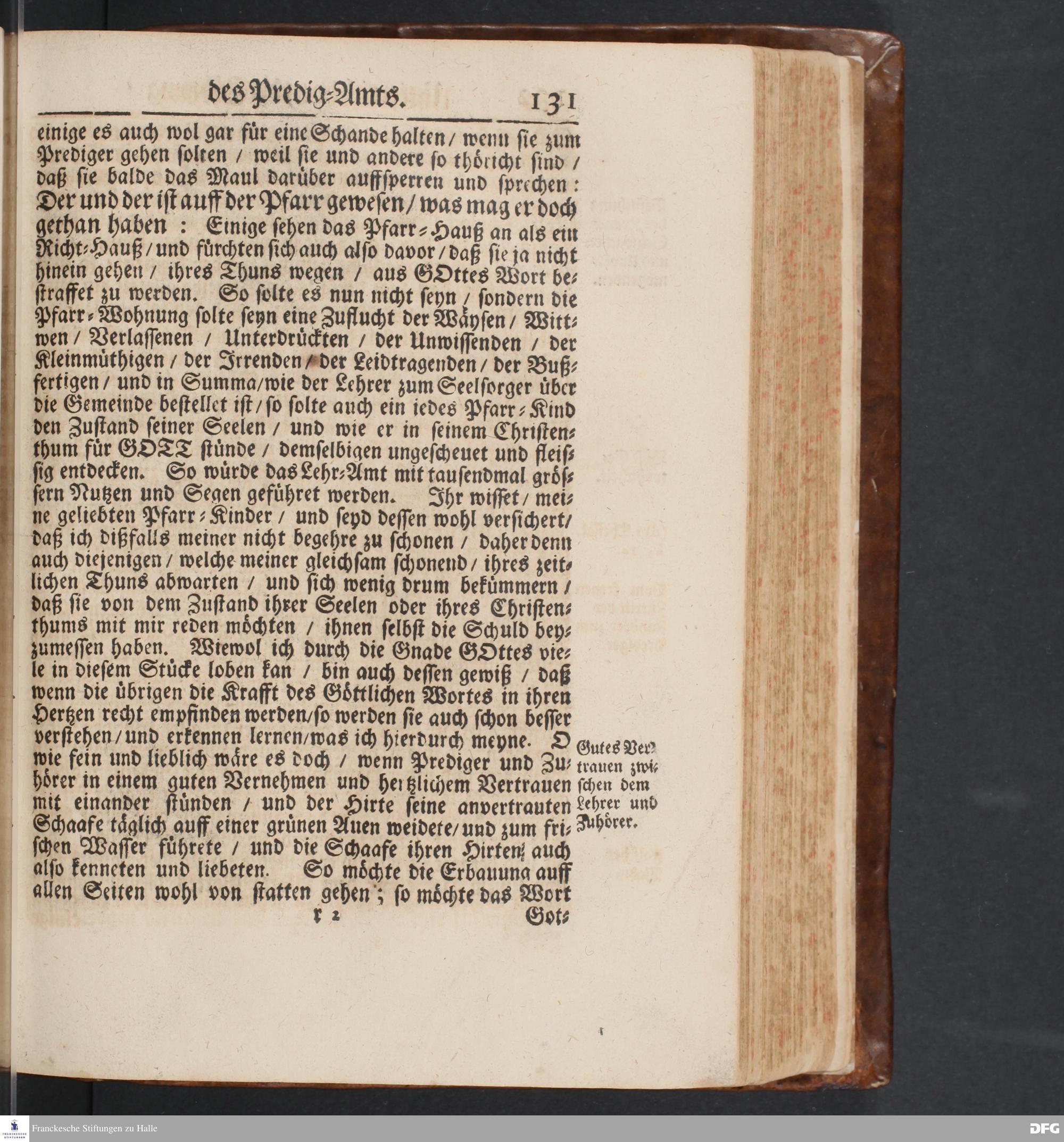 Einfältiger Unterricht Von der Führung des Predig=Amts Und dessen heilsamer Anwendung an Seiten der Zuhörer / Die Heiligung der Sonn= Fest= Apostel= Buß=und Bet=Tage / wie auch der Fasten=Zeit / die Wiederholung der Predigten / Catechisation, Wochen=Predigten / Betstunden / und insgemein die Handlung des Göttlichen Worts betreffend / Ehedessen unter dem Titul Des Glauchischen Gedenck=Büchleins Auff den Zustand Der Gemeinde zu Glauche an Halle / Wie sich derselbe Anno 1693.befunden / gerichtet von August Hermann Francken / S.Theol.Prof.Ord.& Past.Glauch.