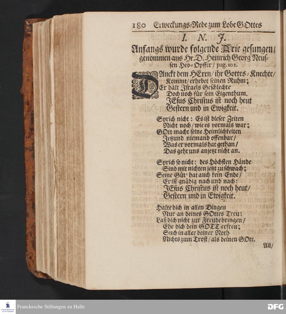 August Hermann Franckens/ S.S. Theol. P.P. Ord. & Past. Glauch. Erweckungs=Rede Zum Lobe Gottes und zum Vertrauen auff Gott / In dem neu=angelegten Wäysen=Hause zu Glaucha an Halle gehalten. Den 29. April 1700