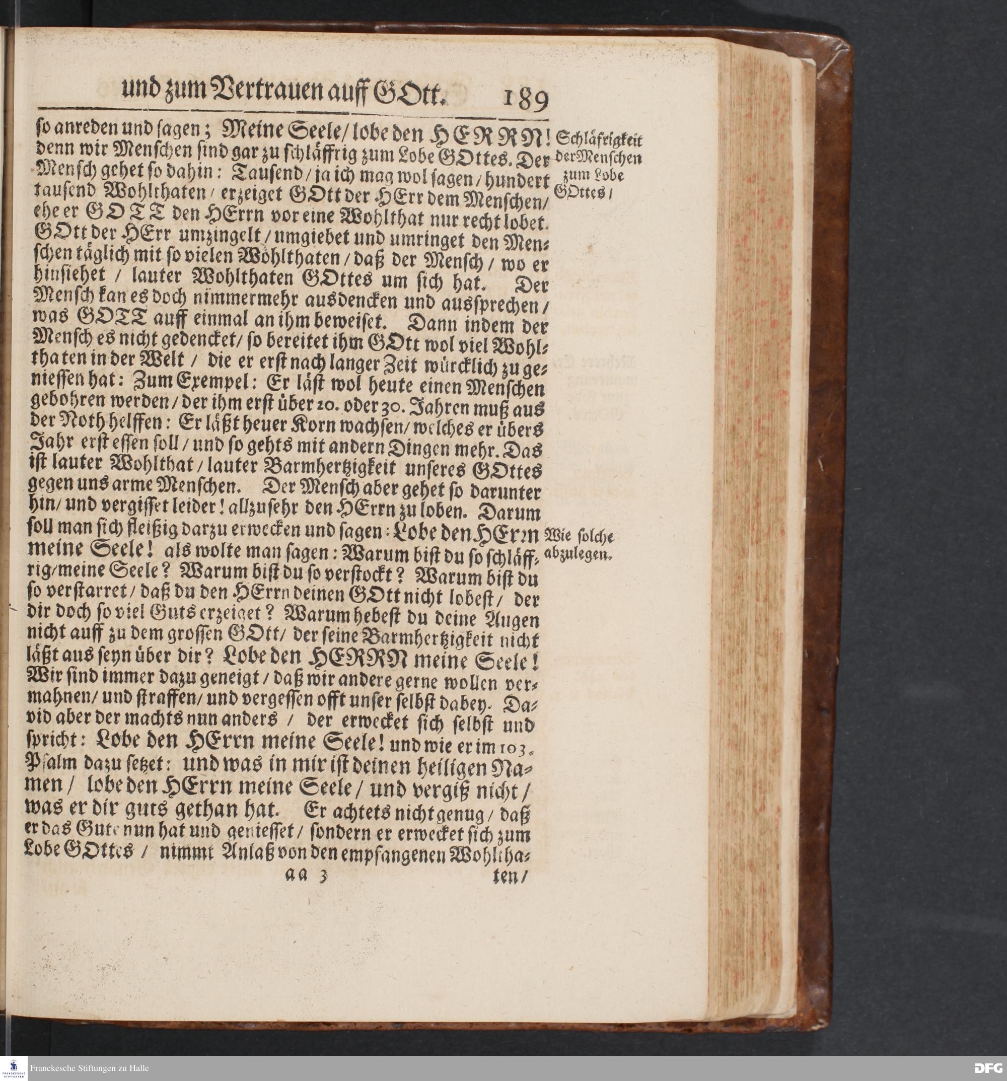 August Hermann Franckens/ S.S. Theol. P.P. Ord. & Past. Glauch. Erweckungs=Rede Zum Lobe Gottes und zum Vertrauen auff Gott / In dem neu=angelegten Wäysen=Hause zu Glaucha an Halle gehalten. Den 29. April 1700