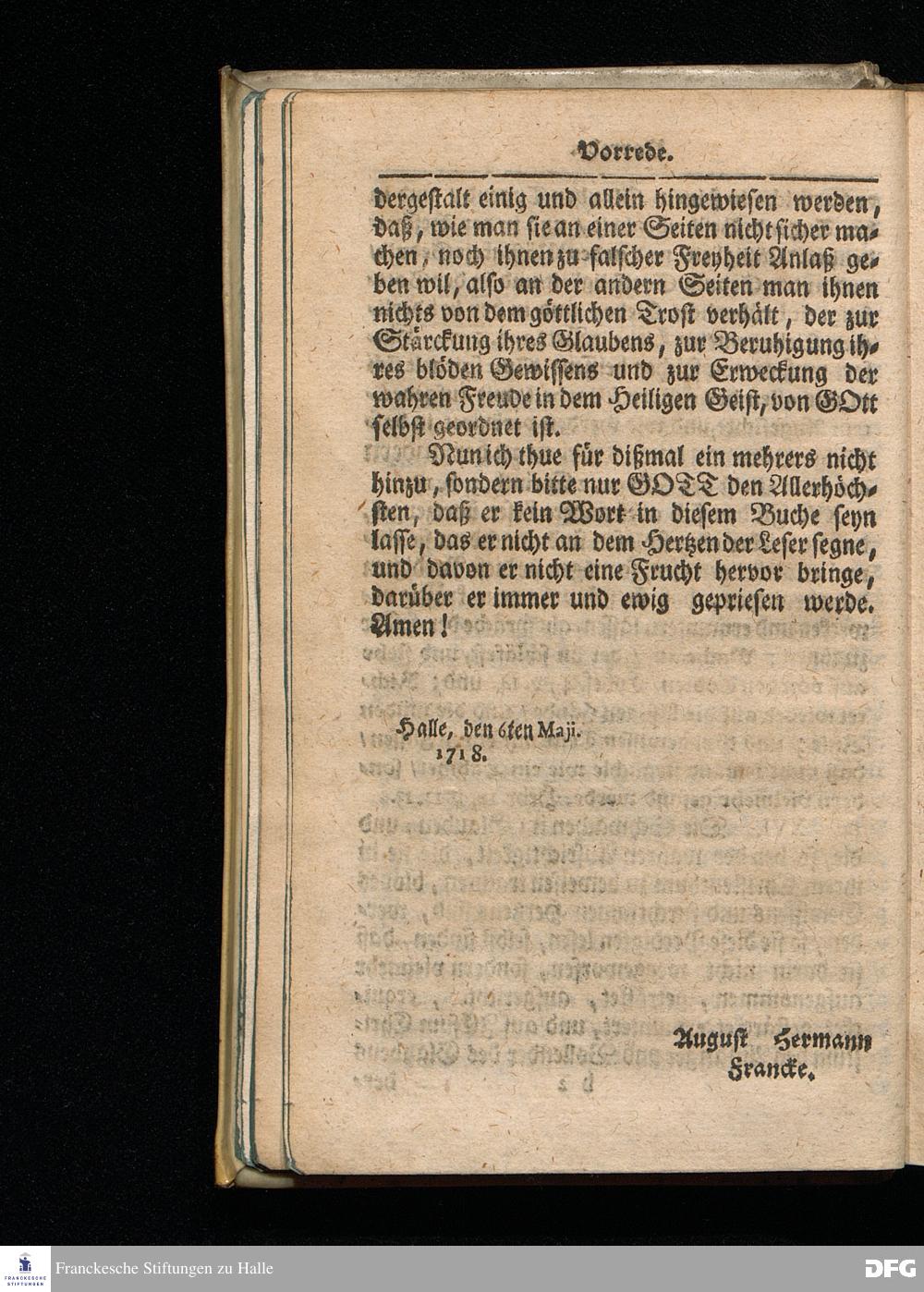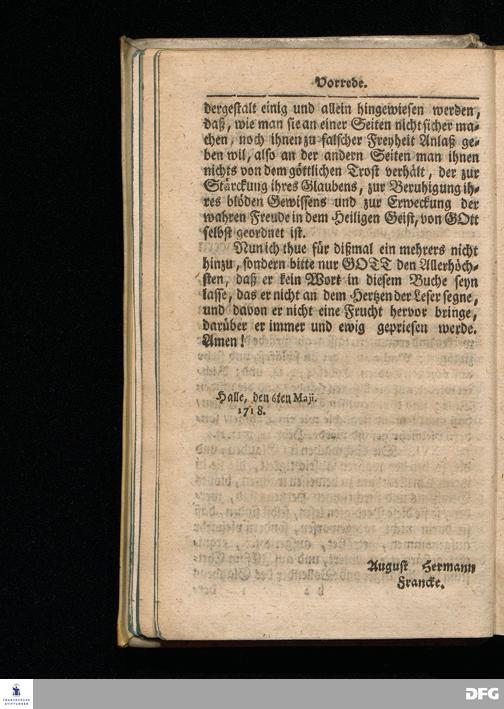 August Hermann Franckens / S.Theol.Prof.& Past. zu S.Ulrich, und des Gymnasii Scholarchæ, Kurtze Sonn= und Fest=Tags=Predigten / Darinnen Vornemlich zum wahren / lebendigen / Kraft=vollen und in guten Früchten sich beweisenden Glauben, die nöthige Aufweckung und Anweisung gegeben wird. Die andere EDITION, mit einer neuen Vorrede und einem Register versehen. HALLE, in Verlegung des Wäysen=Hause MDCCXVIII.