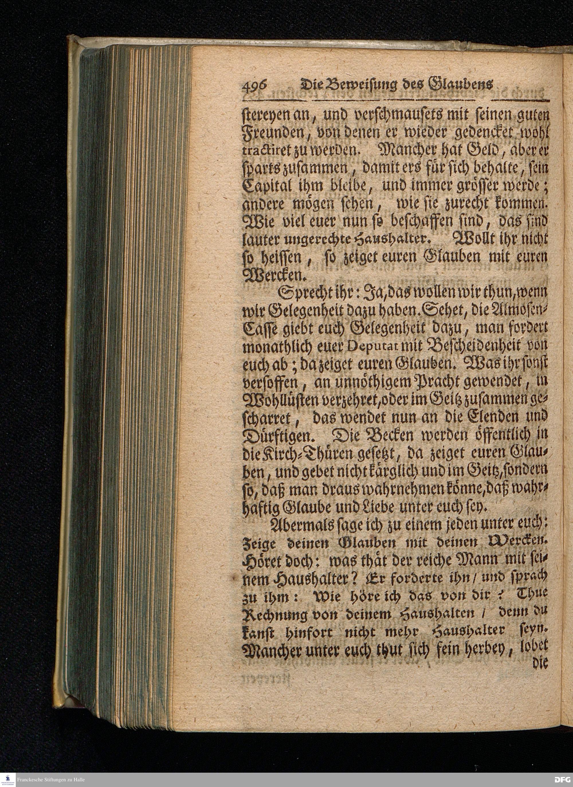 August Hermann Franckens / S.Theol.Prof.& Past. zu S.Ulrich, und des Gymnasii Scholarchæ, Kurtze Sonn= und Fest=Tags=Predigten / Darinnen Vornemlich zum wahren / lebendigen / Kraft=vollen und in guten Früchten sich beweisenden Glauben, die nöthige Aufweckung und Anweisung gegeben wird. Die andere EDITION, mit einer neuen Vorrede und einem Register versehen. HALLE, in Verlegung des Wäysen=Hause MDCCXVIII.