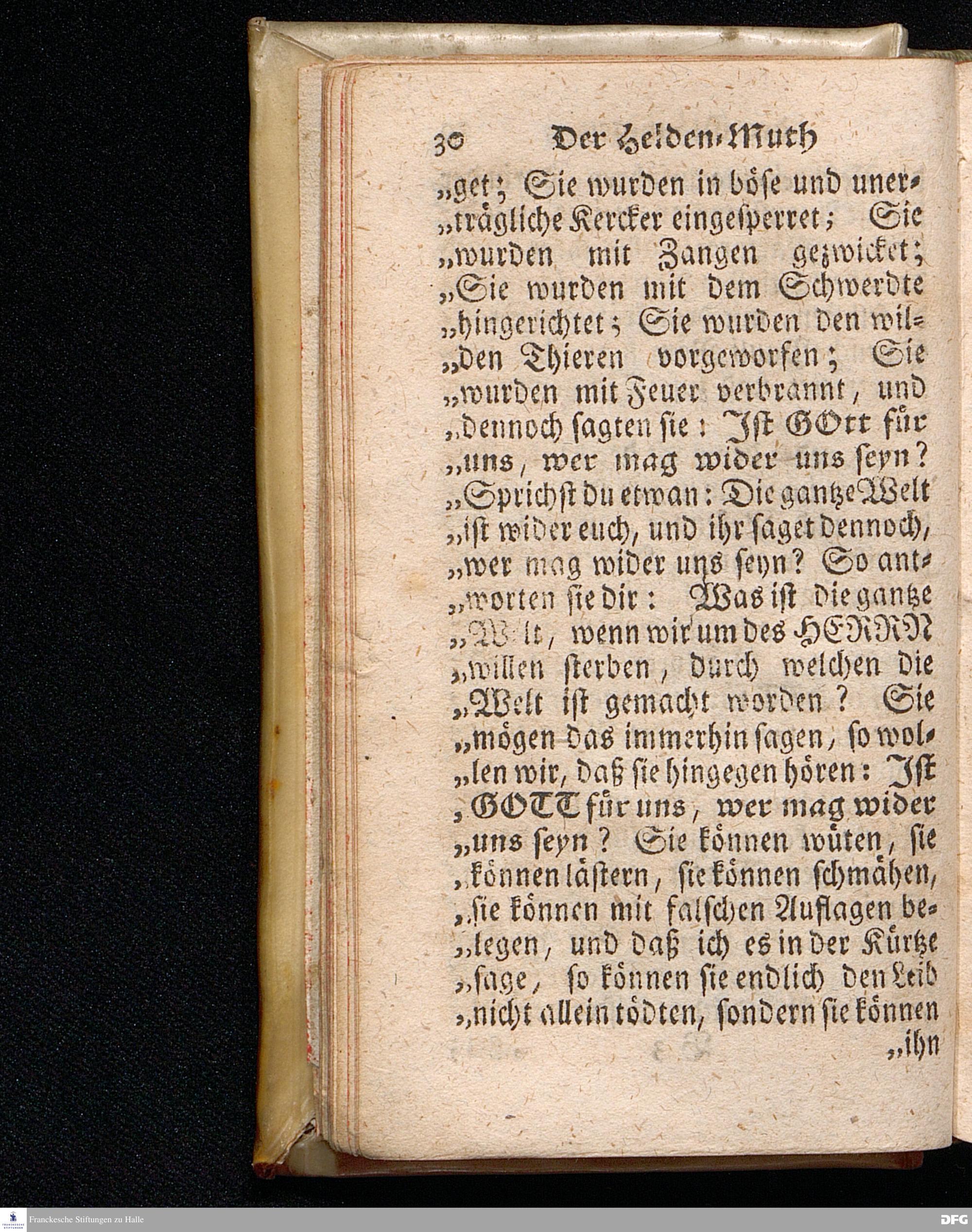 Der Helden=Muth der Gläubigen, In einer vor dem hier versammleten Hochfürstlichen Dessauischen Regiment, am Sonntag Jubilate 1720. gehaltenen Predigt / aus denen dazu vorgeschriebenen Text=Worten, Luc.XII,1--5. in der Schul=Kirche zu Halle vorgestellet von August Hermann Francken / S.Th.Prof.Past.Vlr.& Schol. Andere Auflage. HALLE, gedruckt im Wäysen=Hause. MDCCXXIII.