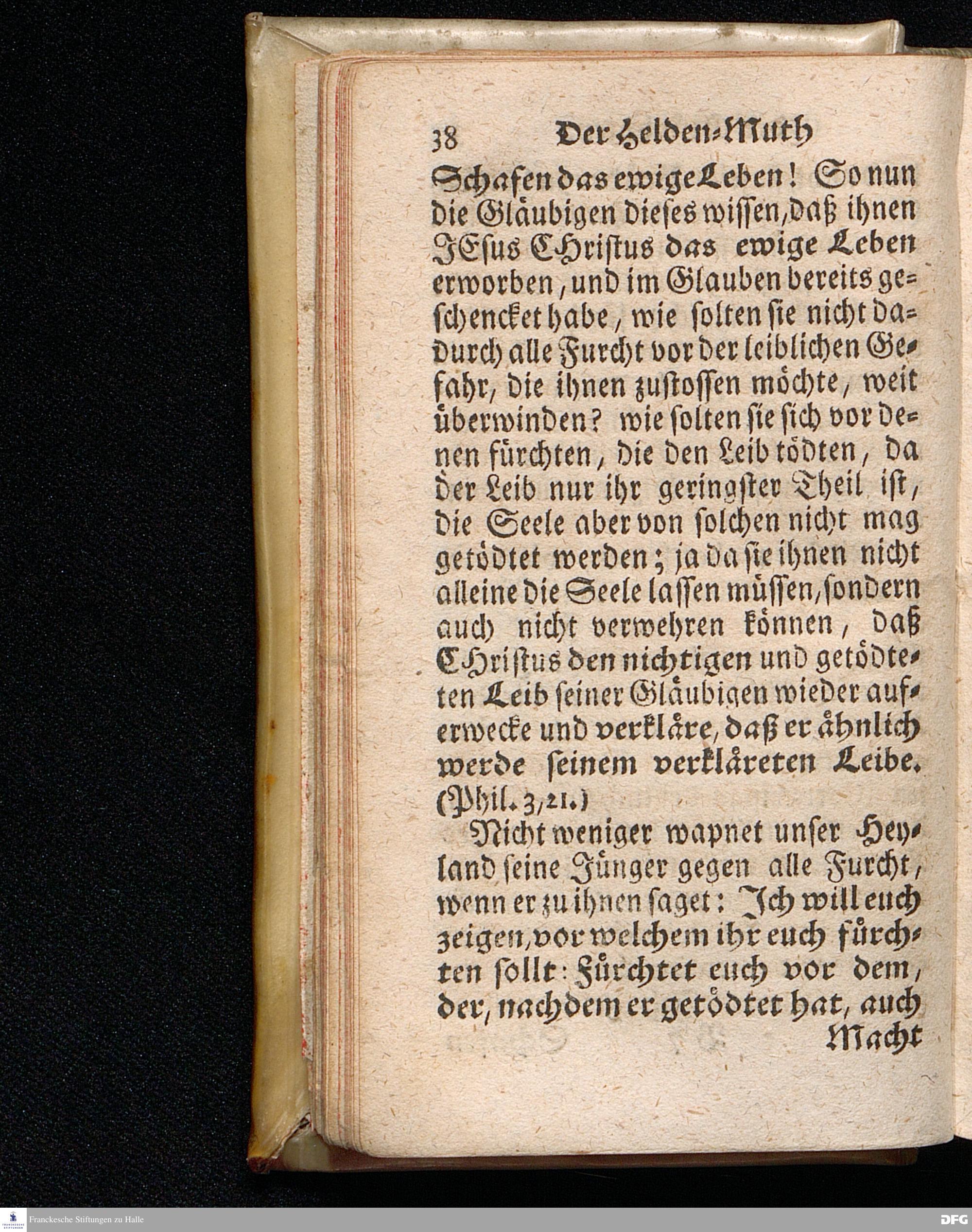 Der Helden=Muth der Gläubigen, In einer vor dem hier versammleten Hochfürstlichen Dessauischen Regiment, am Sonntag Jubilate 1720. gehaltenen Predigt / aus denen dazu vorgeschriebenen Text=Worten, Luc.XII,1--5. in der Schul=Kirche zu Halle vorgestellet von August Hermann Francken / S.Th.Prof.Past.Vlr.& Schol. Andere Auflage. HALLE, gedruckt im Wäysen=Hause. MDCCXXIII.