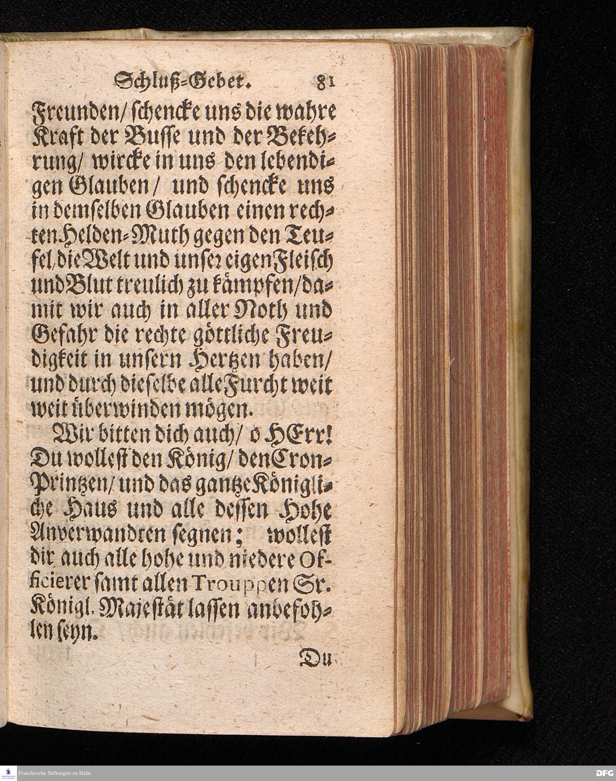 Der Helden=Muth der Gläubigen, In einer vor dem hier versammleten Hochfürstlichen Dessauischen Regiment, am Sonntag Jubilate 1720. gehaltenen Predigt / aus denen dazu vorgeschriebenen Text=Worten, Luc.XII,1--5. in der Schul=Kirche zu Halle vorgestellet von August Hermann Francken / S.Th.Prof.Past.Vlr.& Schol. Andere Auflage. HALLE, gedruckt im Wäysen=Hause. MDCCXXIII.