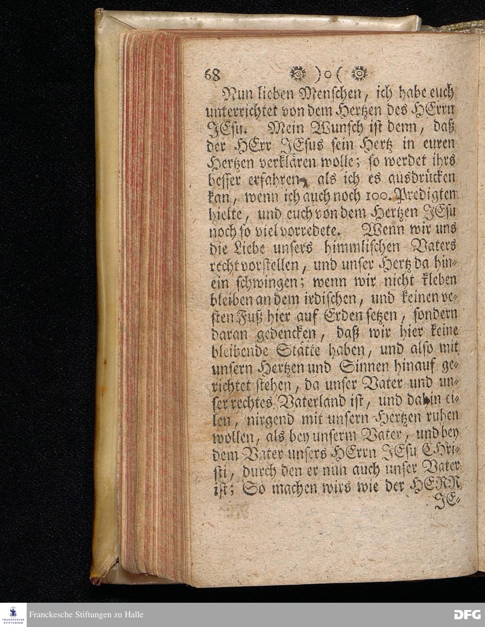 Das Hertz des auferstandenen JESU, vorgestellet in einer Am andern Oster=Tage ANNO 1707. In der Schul=Kirchen zu Halle, über Joh.XX, 17. gehaltenen und nach dem Examine der Schul=Jugend in dem Wäysen=Hause den 18 May Ausgetheilten Predigt, von August Hermann Francken, S.Th.Prof.Ord.Past.Vlric.und Scholarcha. Andere Auflage. HALLE, in Verlegung des Wäysen=Hauses, MDCCXXIX.