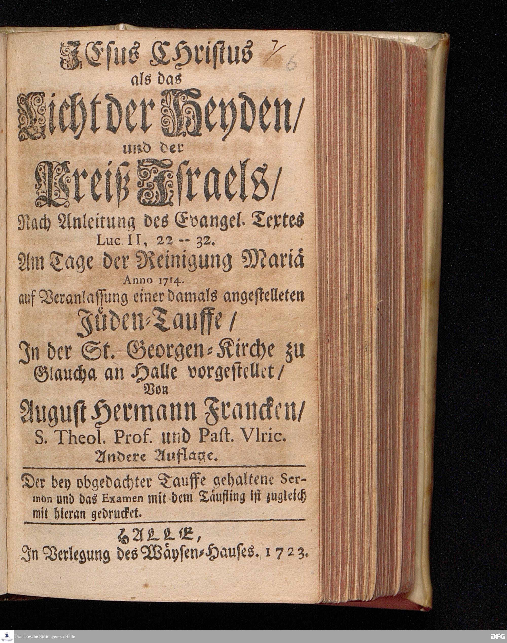 JEsus CHristus als das Licht der Heyden / und der Preiß Israels / Nach Anleitung des Evangel. Textes Luc.II, 22--32. Am Tage der Reinigung Mariä Anno 1714. auf Veranlassung einer damals angestelleten Jüden=Tauffe / In der St.Georgen=Kirche zu Glaucha an Halle vorgestellet / Von August Hermann Francken / S.Theol.Prof.und Past.Vlric. Andere Auflage. Der bey obgedachter Tauffe gehaltene Sermon und das Examen mit dem Täufling ist zugleich mit hieran gedrucket. HALLE, In Verlegung des Wäysen=Hauses. 1723