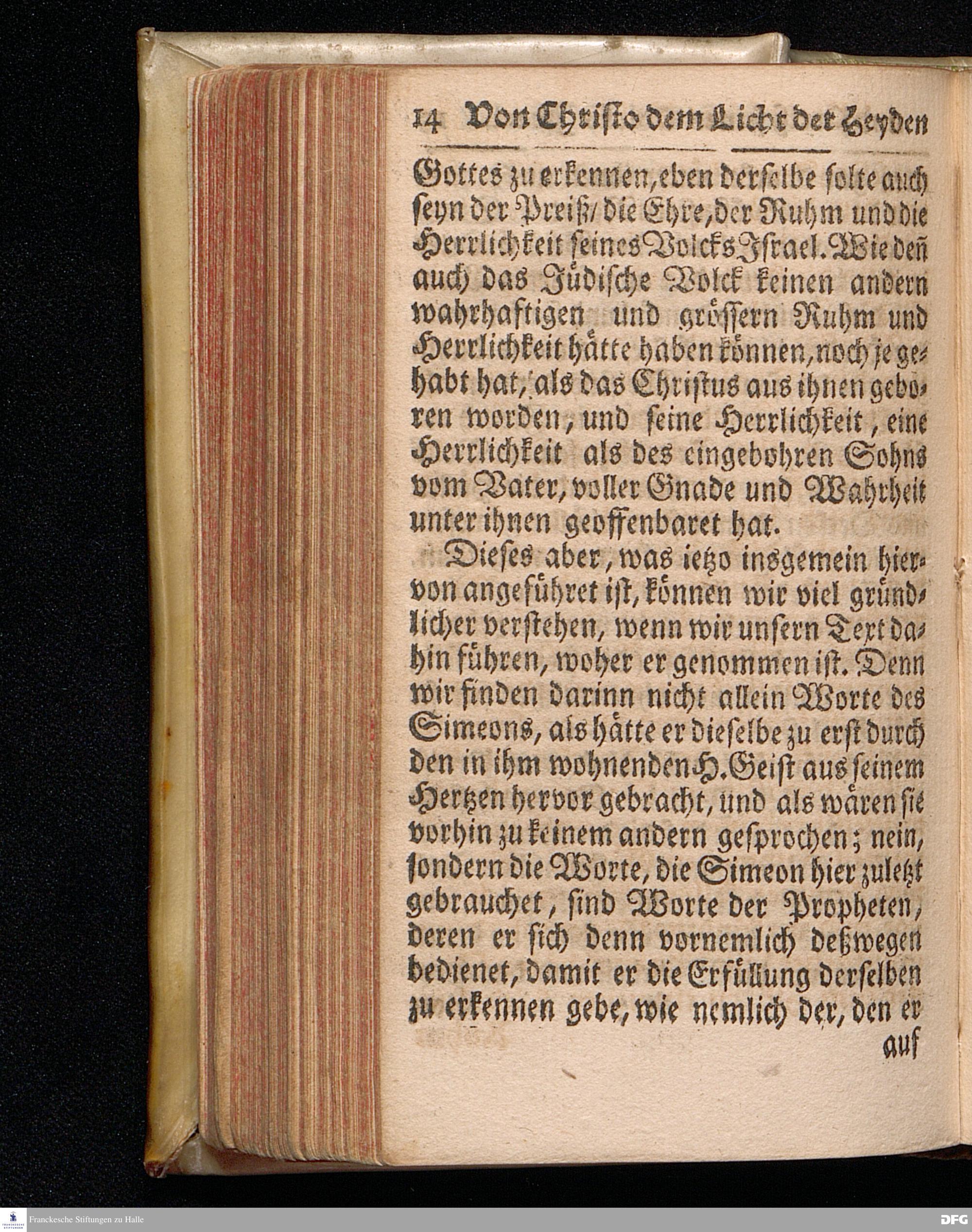 JEsus CHristus als das Licht der Heyden / und der Preiß Israels / Nach Anleitung des Evangel. Textes Luc.II, 22--32. Am Tage der Reinigung Mariä Anno 1714. auf Veranlassung einer damals angestelleten Jüden=Tauffe / In der St.Georgen=Kirche zu Glaucha an Halle vorgestellet / Von August Hermann Francken / S.Theol.Prof.und Past.Vlric. Andere Auflage. Der bey obgedachter Tauffe gehaltene Sermon und das Examen mit dem Täufling ist zugleich mit hieran gedrucket. HALLE, In Verlegung des Wäysen=Hauses. 1723
