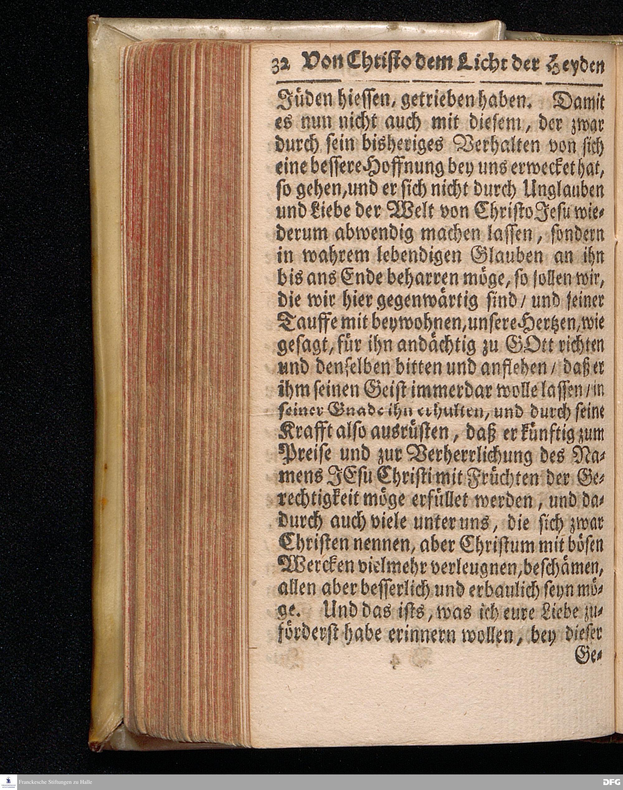 JEsus CHristus als das Licht der Heyden / und der Preiß Israels / Nach Anleitung des Evangel. Textes Luc.II, 22--32. Am Tage der Reinigung Mariä Anno 1714. auf Veranlassung einer damals angestelleten Jüden=Tauffe / In der St.Georgen=Kirche zu Glaucha an Halle vorgestellet / Von August Hermann Francken / S.Theol.Prof.und Past.Vlric. Andere Auflage. Der bey obgedachter Tauffe gehaltene Sermon und das Examen mit dem Täufling ist zugleich mit hieran gedrucket. HALLE, In Verlegung des Wäysen=Hauses. 1723