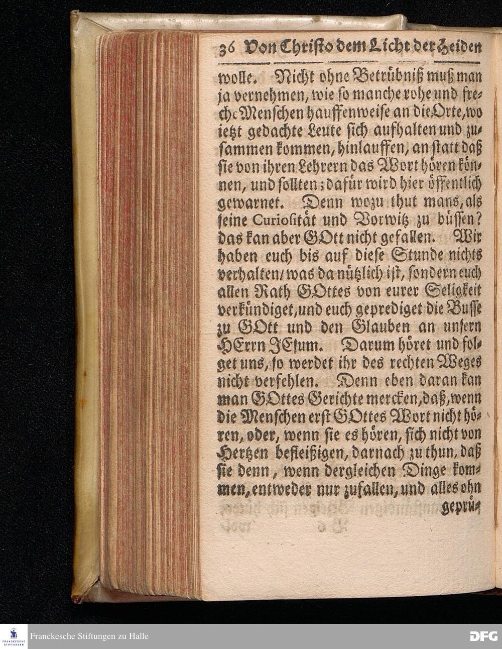 JEsus CHristus als das Licht der Heyden / und der Preiß Israels / Nach Anleitung des Evangel. Textes Luc.II, 22--32. Am Tage der Reinigung Mariä Anno 1714. auf Veranlassung einer damals angestelleten Jüden=Tauffe / In der St.Georgen=Kirche zu Glaucha an Halle vorgestellet / Von August Hermann Francken / S.Theol.Prof.und Past.Vlric. Andere Auflage. Der bey obgedachter Tauffe gehaltene Sermon und das Examen mit dem Täufling ist zugleich mit hieran gedrucket. HALLE, In Verlegung des Wäysen=Hauses. 1723
