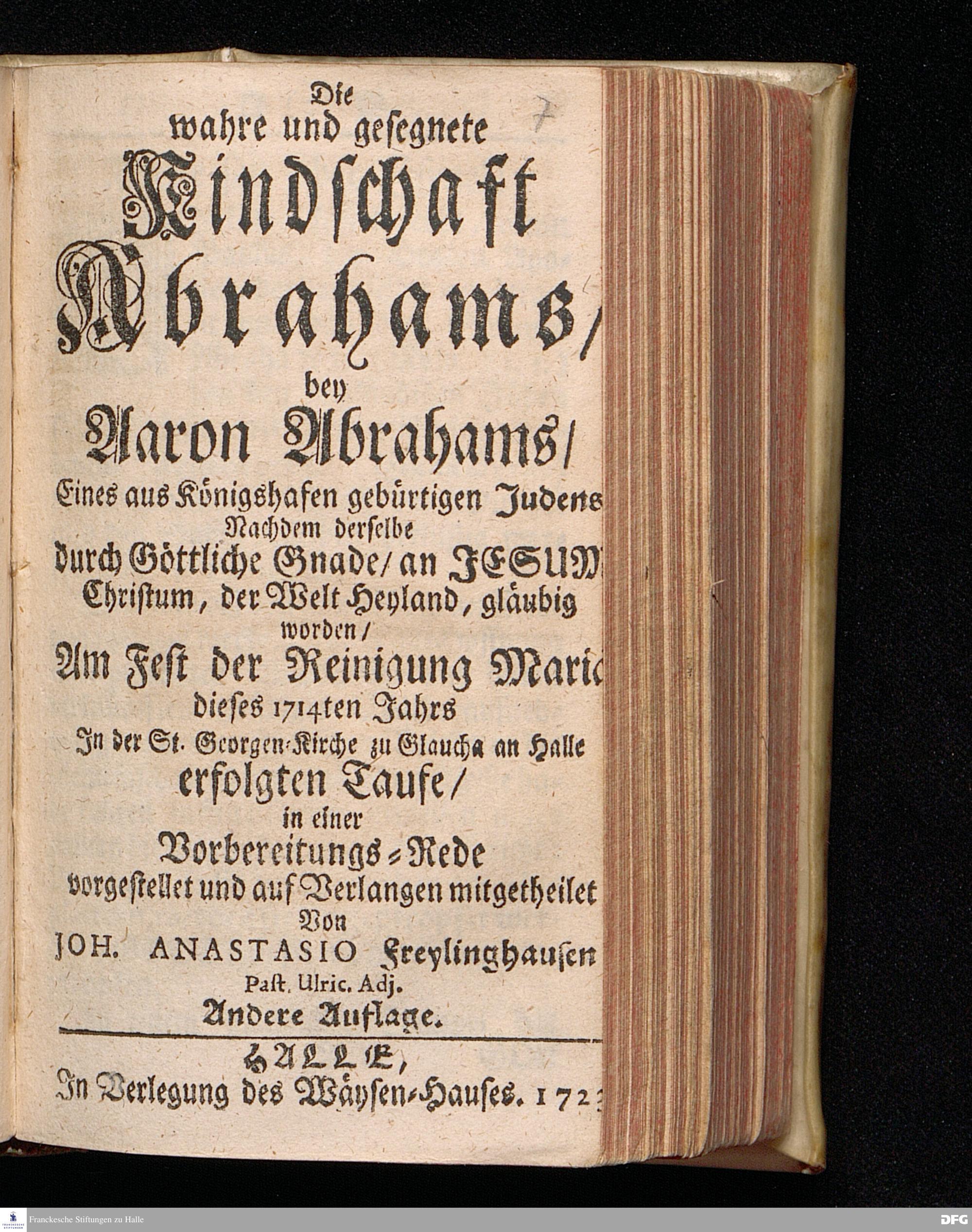 JEsus CHristus als das Licht der Heyden / und der Preiß Israels / Nach Anleitung des Evangel. Textes Luc.II, 22--32. Am Tage der Reinigung Mariä Anno 1714. auf Veranlassung einer damals angestelleten Jüden=Tauffe / In der St.Georgen=Kirche zu Glaucha an Halle vorgestellet / Von August Hermann Francken / S.Theol.Prof.und Past.Vlric. Andere Auflage. Der bey obgedachter Tauffe gehaltene Sermon und das Examen mit dem Täufling ist zugleich mit hieran gedrucket. HALLE, In Verlegung des Wäysen=Hauses. 1723
