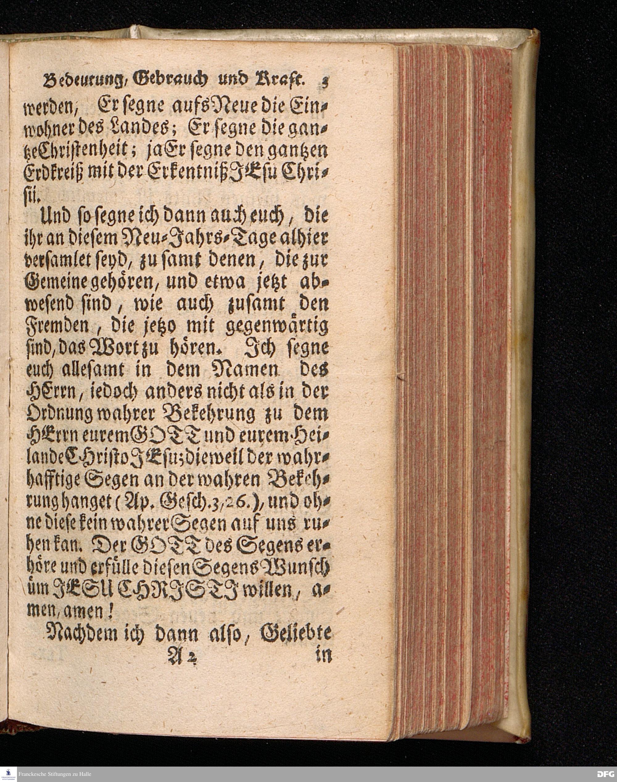 Des Namens JESU Herrliche Bedeutung, rechter Gebrauch / wie auch Segens= und Lebens=volle Kraft / In einer Predigt über den Evangelischen Text Luc.II. v.21. In der St.Georgen=Kirche zu Glaucha an Halle Am Neuen=Jahrs=Tage 1715. vorgestellet von August Hermann Francken / S.Theol.Prof.Ord.& Past.Ulric. HALLE, In Verlegung des Wäysenhauses. 1723.