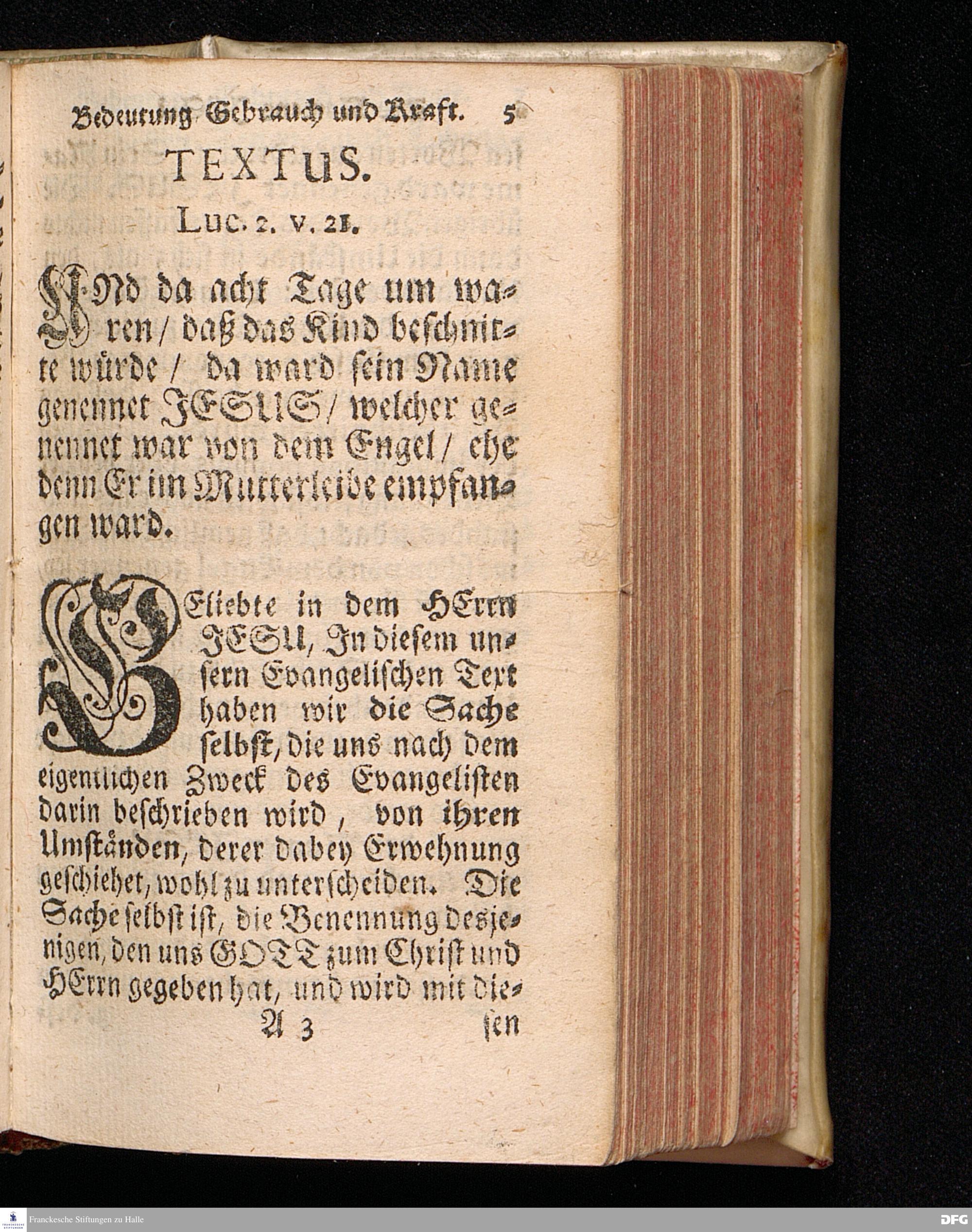 Des Namens JESU Herrliche Bedeutung, rechter Gebrauch / wie auch Segens= und Lebens=volle Kraft / In einer Predigt über den Evangelischen Text Luc.II. v.21. In der St.Georgen=Kirche zu Glaucha an Halle Am Neuen=Jahrs=Tage 1715. vorgestellet von August Hermann Francken / S.Theol.Prof.Ord.& Past.Ulric. HALLE, In Verlegung des Wäysenhauses. 1723.