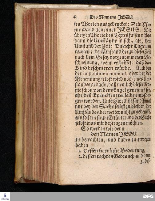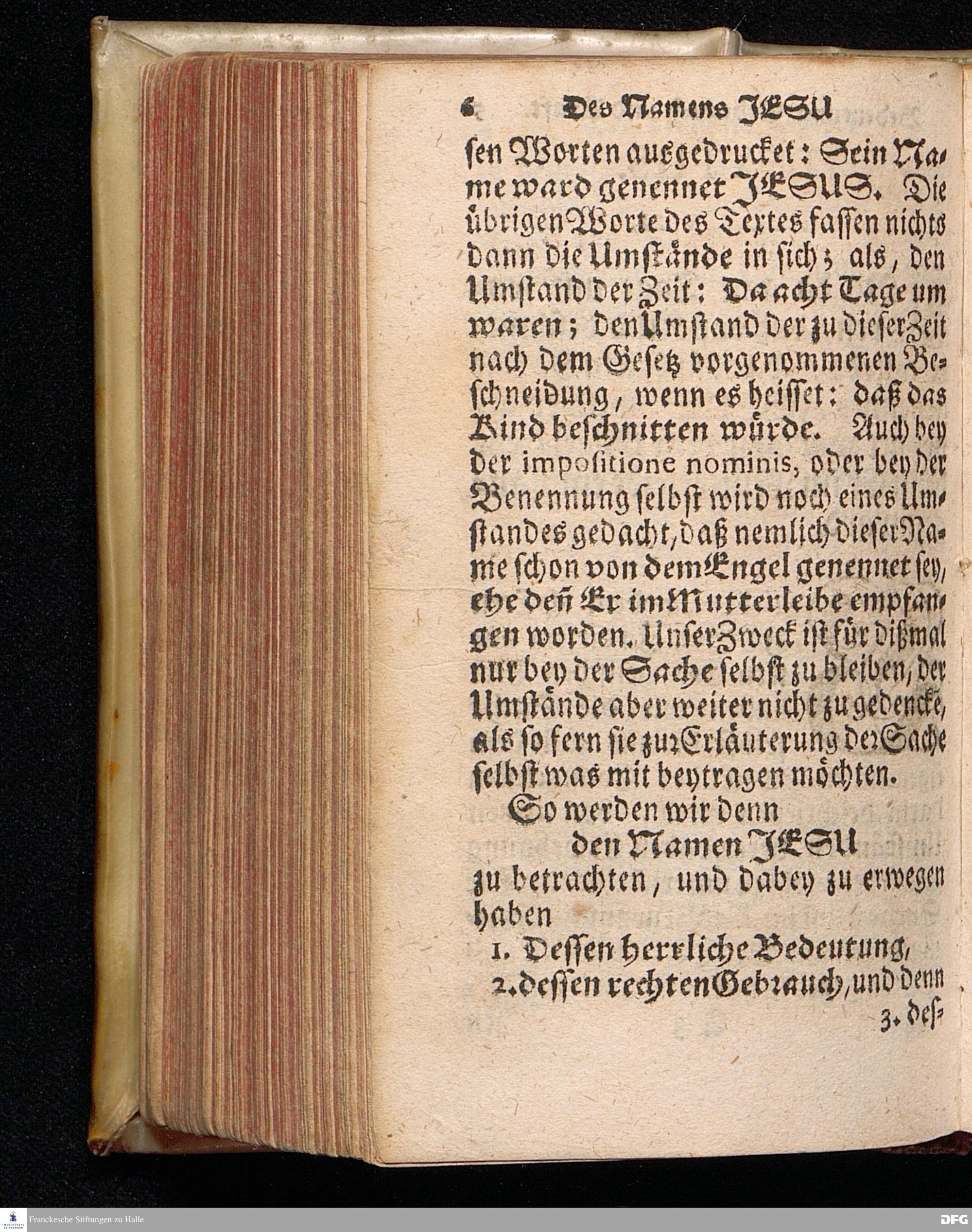 Des Namens JESU Herrliche Bedeutung, rechter Gebrauch / wie auch Segens= und Lebens=volle Kraft / In einer Predigt über den Evangelischen Text Luc.II. v.21. In der St.Georgen=Kirche zu Glaucha an Halle Am Neuen=Jahrs=Tage 1715. vorgestellet von August Hermann Francken / S.Theol.Prof.Ord.& Past.Ulric. HALLE, In Verlegung des Wäysenhauses. 1723.