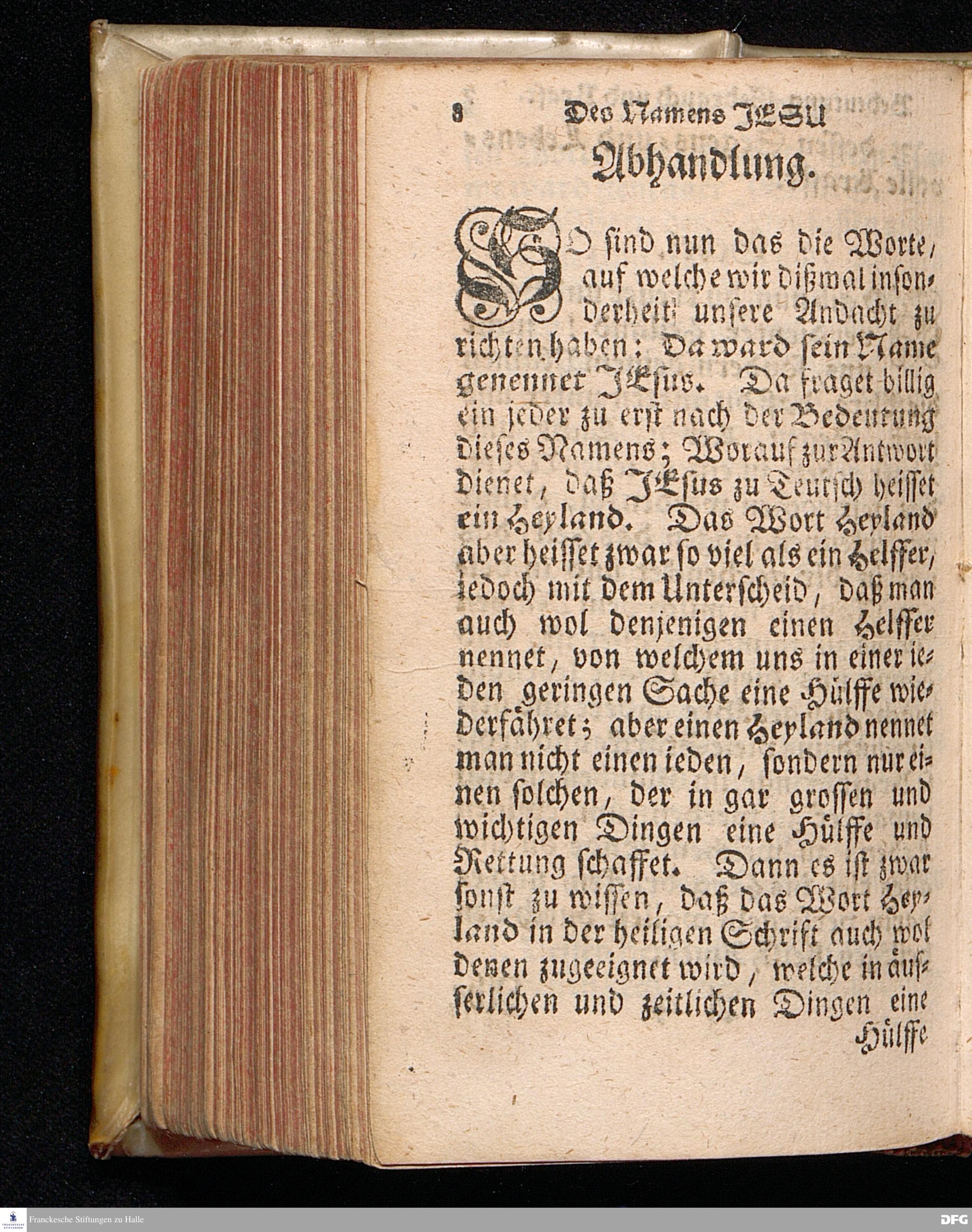 Des Namens JESU Herrliche Bedeutung, rechter Gebrauch / wie auch Segens= und Lebens=volle Kraft / In einer Predigt über den Evangelischen Text Luc.II. v.21. In der St.Georgen=Kirche zu Glaucha an Halle Am Neuen=Jahrs=Tage 1715. vorgestellet von August Hermann Francken / S.Theol.Prof.Ord.& Past.Ulric. HALLE, In Verlegung des Wäysenhauses. 1723.