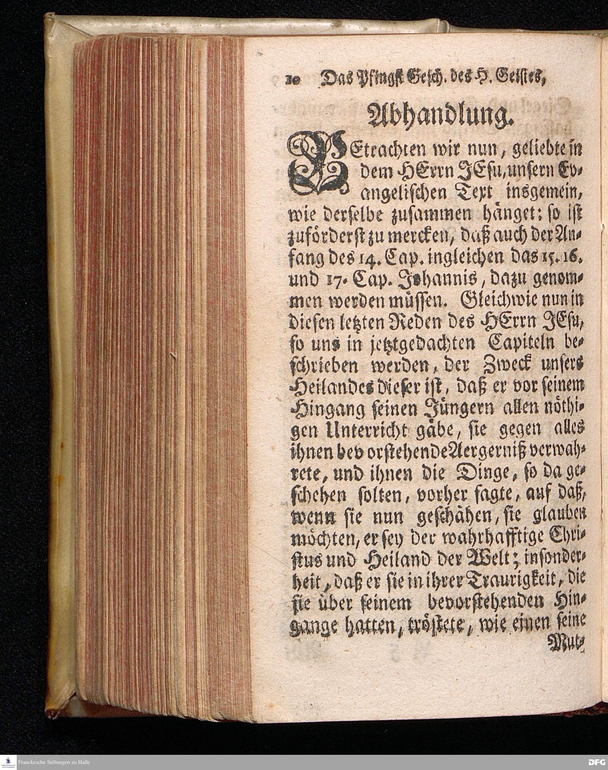 Das Eigentliche Pfingst=Geschäfte Des Heiligen Geistes, Welches ist JESUM CHristum bey denen Menschen zu verklären, Aus dem Evangelischen Text Joh.XIV, 23-31. Am I.Pfingst=Tage MDCCXIV. In der S.Georgen=Kirche zu Glaucha an Halle vorgestellet von August Hermann Francken, S.Theol.Pr.Ord.Past.Vlr.& Sch. Andere Auflage. HALLE, in Verlegung des Wäysenhauses. 1724.