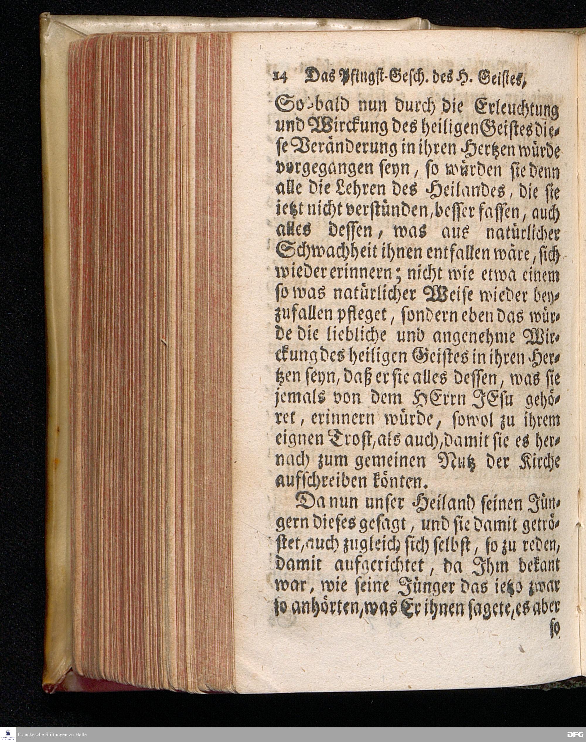 Das Eigentliche Pfingst=Geschäfte Des Heiligen Geistes, Welches ist JESUM CHristum bey denen Menschen zu verklären, Aus dem Evangelischen Text Joh.XIV, 23-31. Am I.Pfingst=Tage MDCCXIV. In der S.Georgen=Kirche zu Glaucha an Halle vorgestellet von August Hermann Francken, S.Theol.Pr.Ord.Past.Vlr.& Sch. Andere Auflage. HALLE, in Verlegung des Wäysenhauses. 1724.
