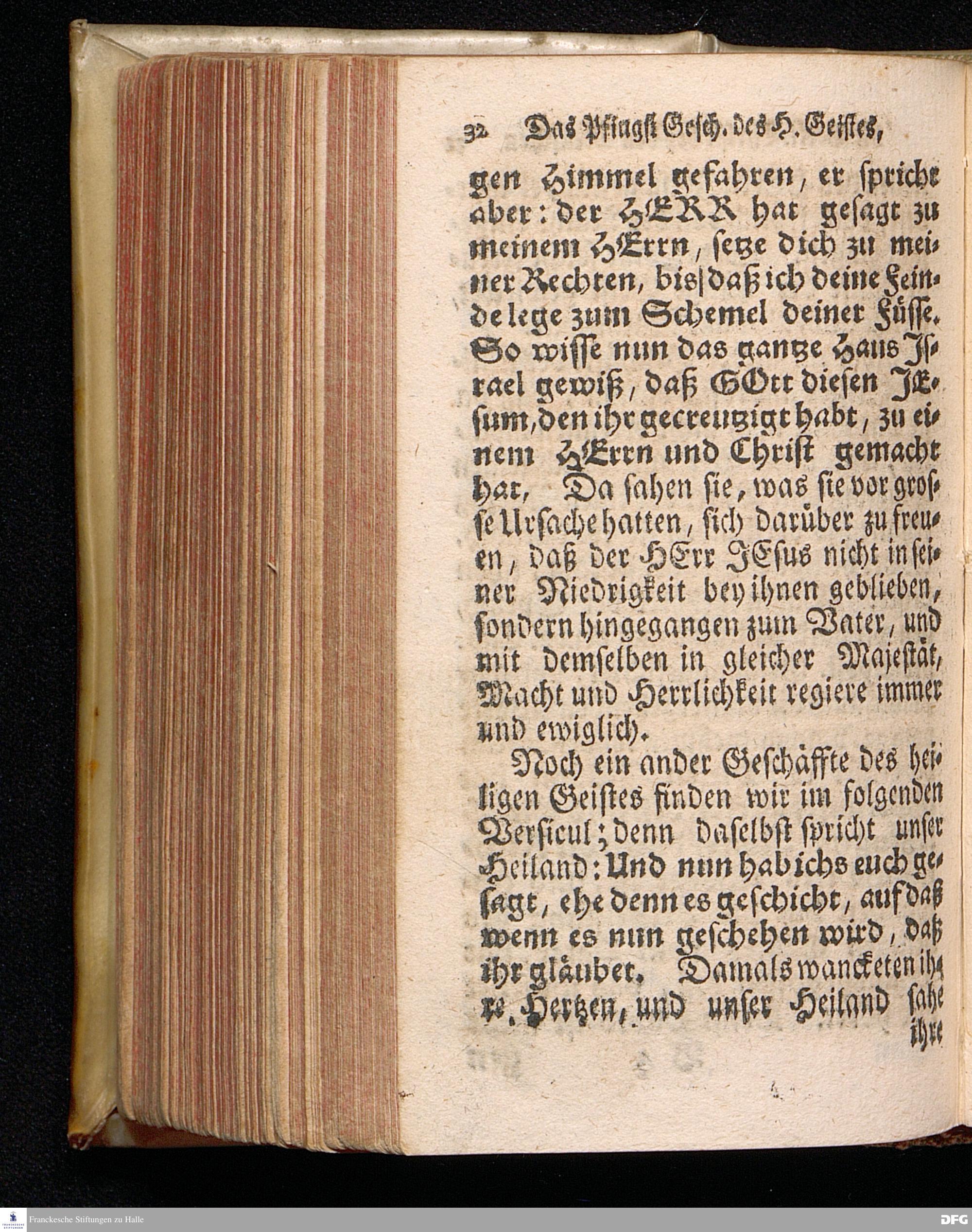 Das Eigentliche Pfingst=Geschäfte Des Heiligen Geistes, Welches ist JESUM CHristum bey denen Menschen zu verklären, Aus dem Evangelischen Text Joh.XIV, 23-31. Am I.Pfingst=Tage MDCCXIV. In der S.Georgen=Kirche zu Glaucha an Halle vorgestellet von August Hermann Francken, S.Theol.Pr.Ord.Past.Vlr.& Sch. Andere Auflage. HALLE, in Verlegung des Wäysenhauses. 1724.