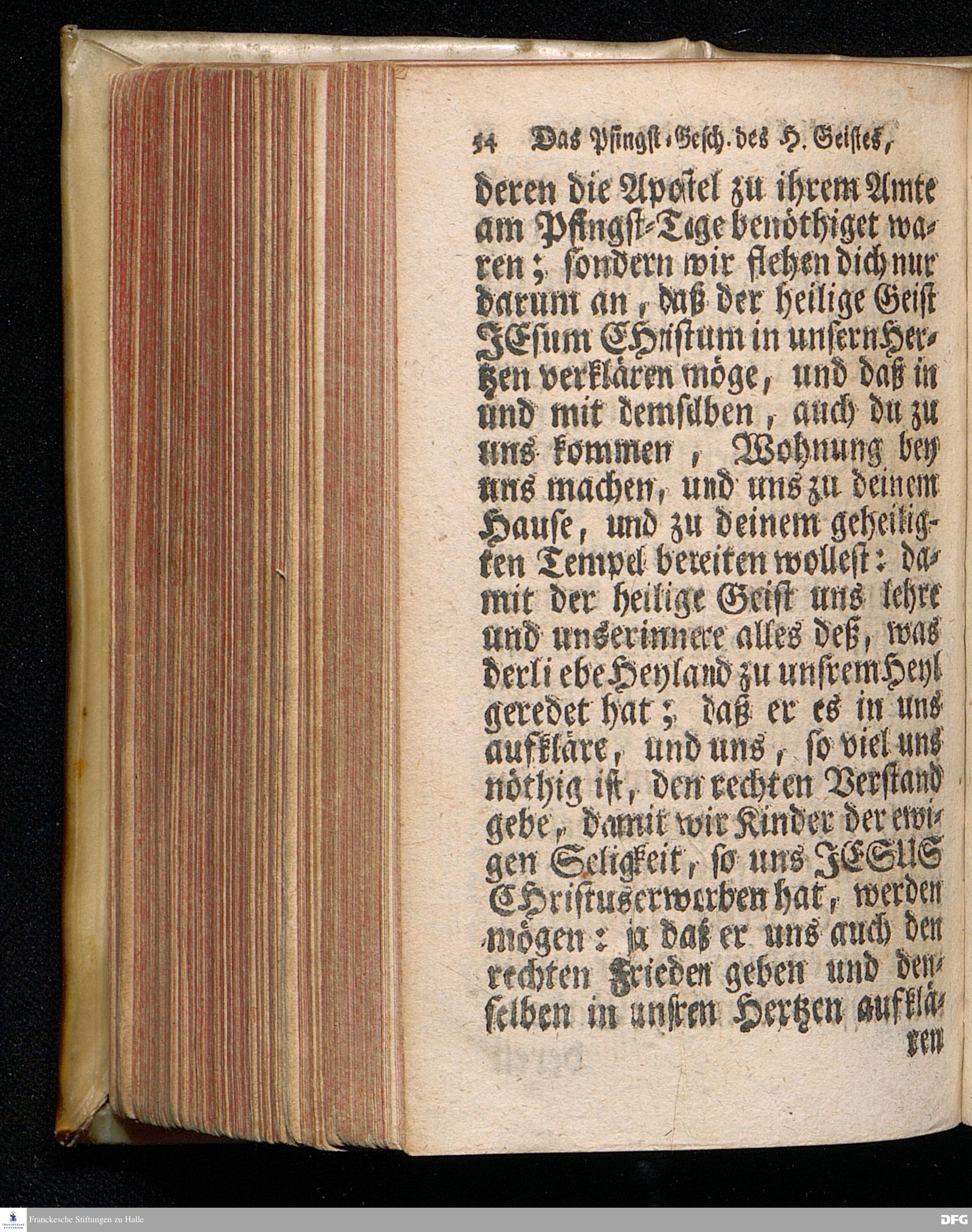 Das Eigentliche Pfingst=Geschäfte Des Heiligen Geistes, Welches ist JESUM CHristum bey denen Menschen zu verklären, Aus dem Evangelischen Text Joh.XIV, 23-31. Am I.Pfingst=Tage MDCCXIV. In der S.Georgen=Kirche zu Glaucha an Halle vorgestellet von August Hermann Francken, S.Theol.Pr.Ord.Past.Vlr.& Sch. Andere Auflage. HALLE, in Verlegung des Wäysenhauses. 1724.