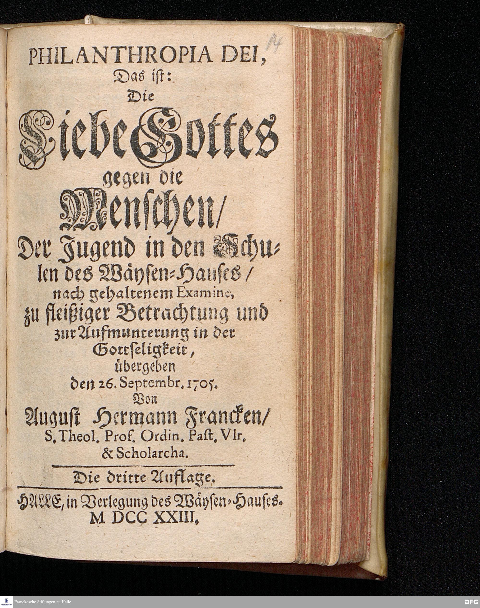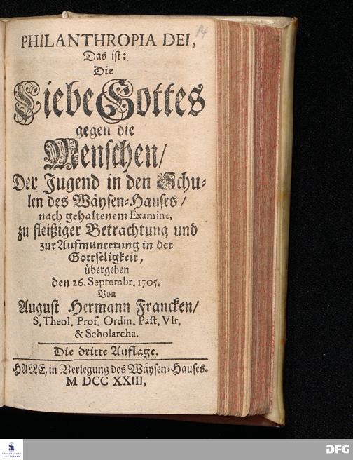 PHILANTHROPIA DEI, Das ist: Die Liebe Gottes gegen die Menschen / Der Jugend in den Schulen des Wäysen=Hauses / nach gehaltenem Examine, zu fleißiger Betrachtung und zur Aufmunterung in der Gottseligkeit, übergeben den 26.Septembr. 1705. Von August Hermann Francken / S.Theol.Prof.Ordin.Past.Vlr.& Scholarcha. Die dritte Auflage. HALLE, in Verlegung des Wäysen=Hauses. MDCCXXIII.