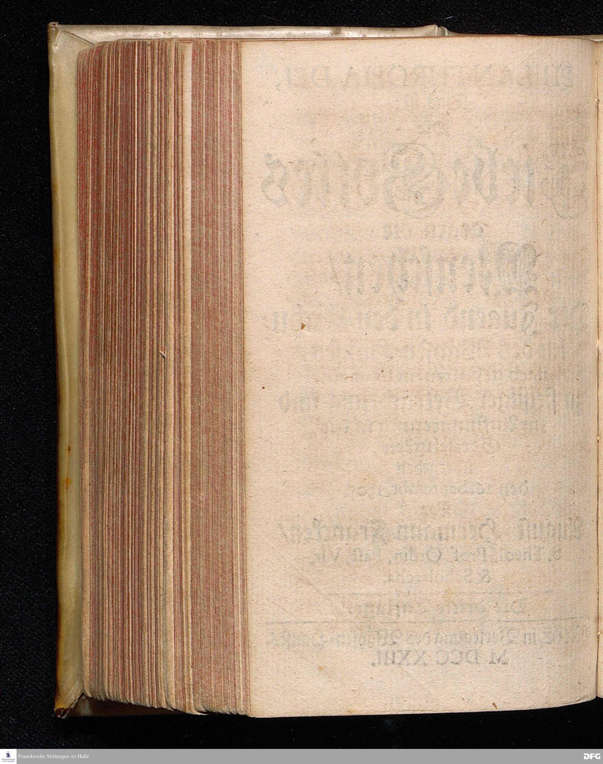 PHILANTHROPIA DEI, Das ist: Die Liebe Gottes gegen die Menschen / Der Jugend in den Schulen des Wäysen=Hauses / nach gehaltenem Examine, zu fleißiger Betrachtung und zur Aufmunterung in der Gottseligkeit, übergeben den 26.Septembr. 1705. Von August Hermann Francken / S.Theol.Prof.Ordin.Past.Vlr.& Scholarcha. Die dritte Auflage. HALLE, in Verlegung des Wäysen=Hauses. MDCCXXIII.