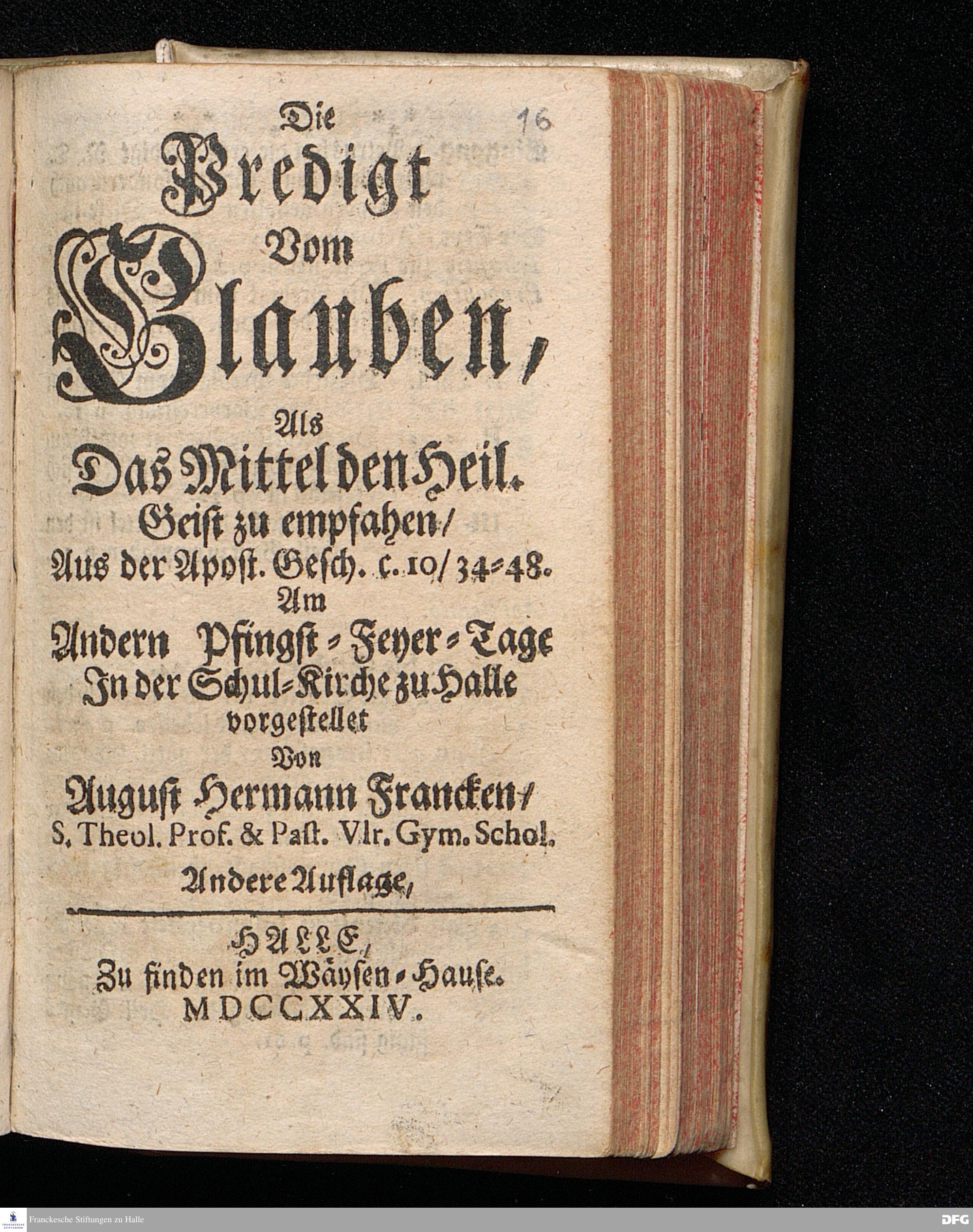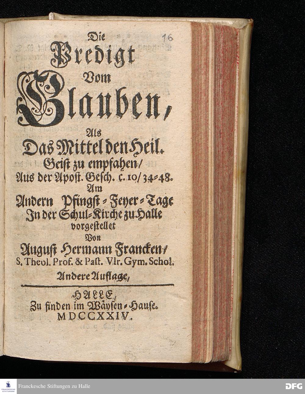 Die Predigt Vom Glauben, Als Das Mittel den Heil. Geist zu empfahen / Aus der Apost.Gesch.c.10 / 34=48. Am Andern Pfingst=Feyer=Tage In der Schul=Kirche zu Halle vorgestellet Von August Hermann Francken / S.Theol.Prof.& Past.Vlr.Gym.Schol. Andere Auflage, HALLE, Zu finden im Wäysen=Hause. MDCCXXIV.