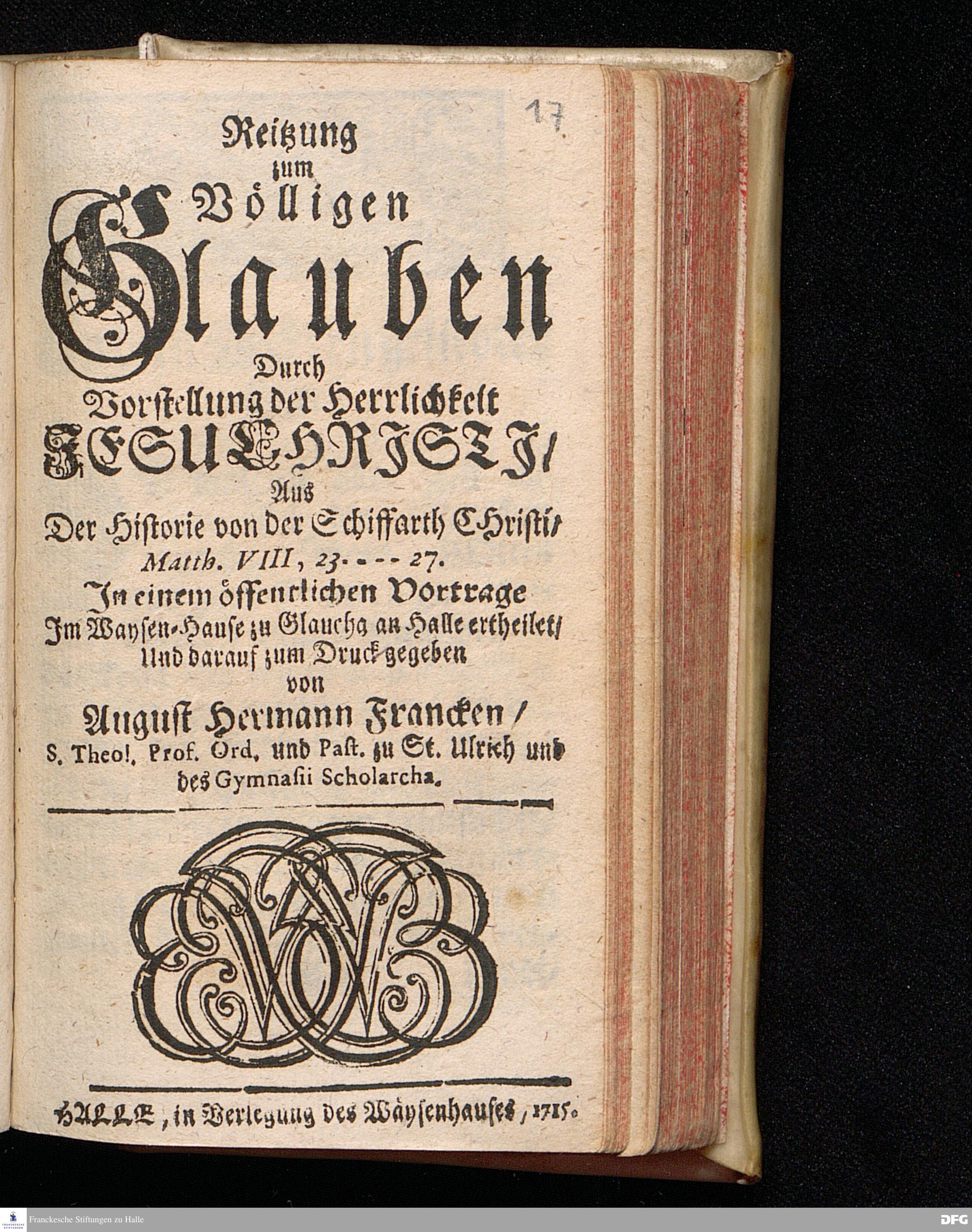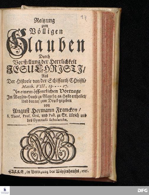 Reitzung zum Völligen Glauben Durch Vorstellung der Herrlichkeit JESU CHRISTI / Aus Der Historie von der Schiffarth CHristi / Matth.VIII, 23---27. In einem öffentlichen Vortrage Im Waysen=Hause zu Glaucha an Halle ertheilet / Und darauf zum Druck gegeben von August Hermann Francken / S.Theol.Prof.Ord.und Past.zu St.Ulrich und des Gymnasii Scholarcha. HALLE, in Verlegung des Wäysen=Hauses, 1715.