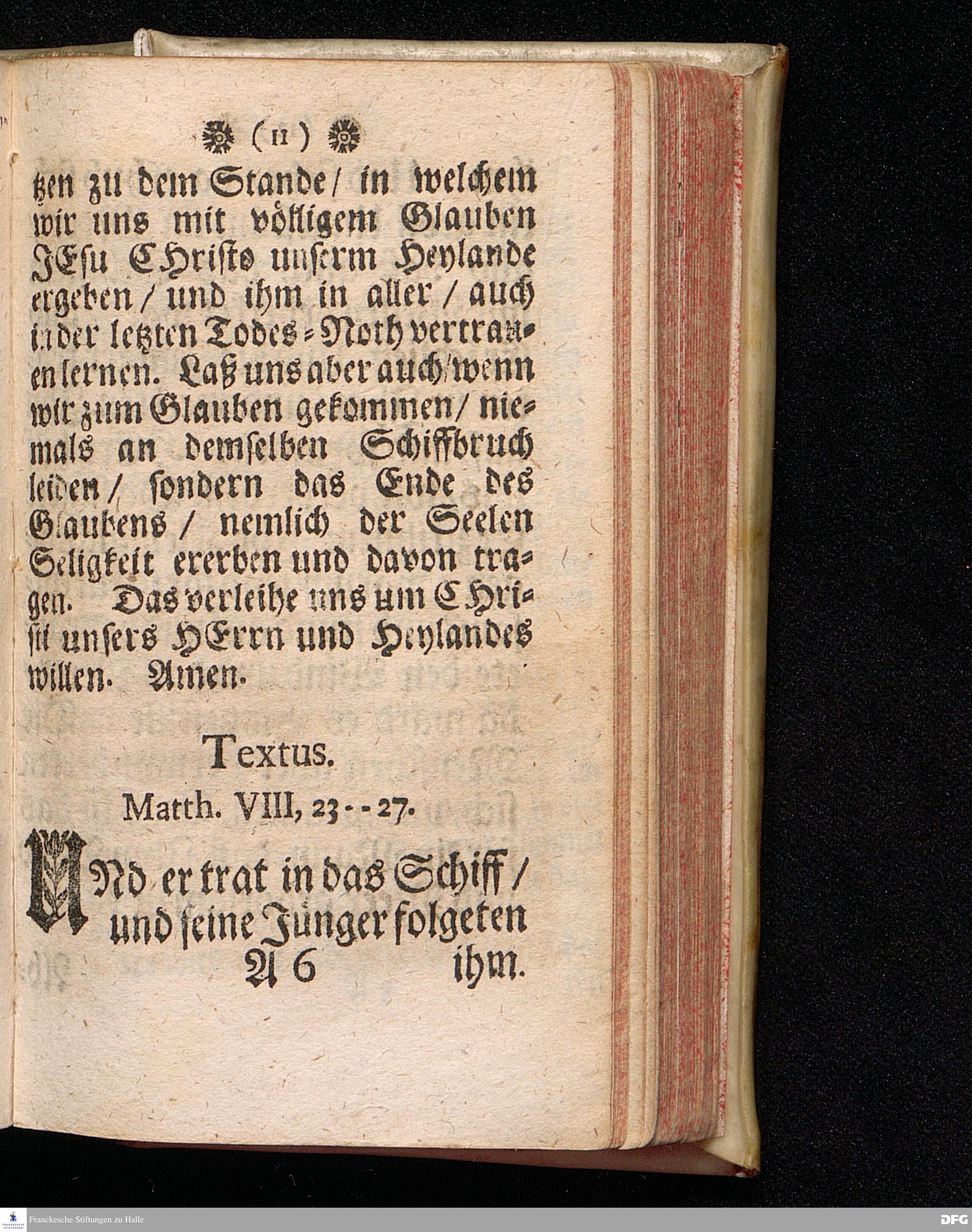 Reitzung zum Völligen Glauben Durch Vorstellung der Herrlichkeit JESU CHRISTI / Aus Der Historie von der Schiffarth CHristi / Matth.VIII, 23---27. In einem öffentlichen Vortrage Im Waysen=Hause zu Glaucha an Halle ertheilet / Und darauf zum Druck gegeben von August Hermann Francken / S.Theol.Prof.Ord.und Past.zu St.Ulrich und des Gymnasii Scholarcha. HALLE, in Verlegung des Wäysen=Hauses, 1715.