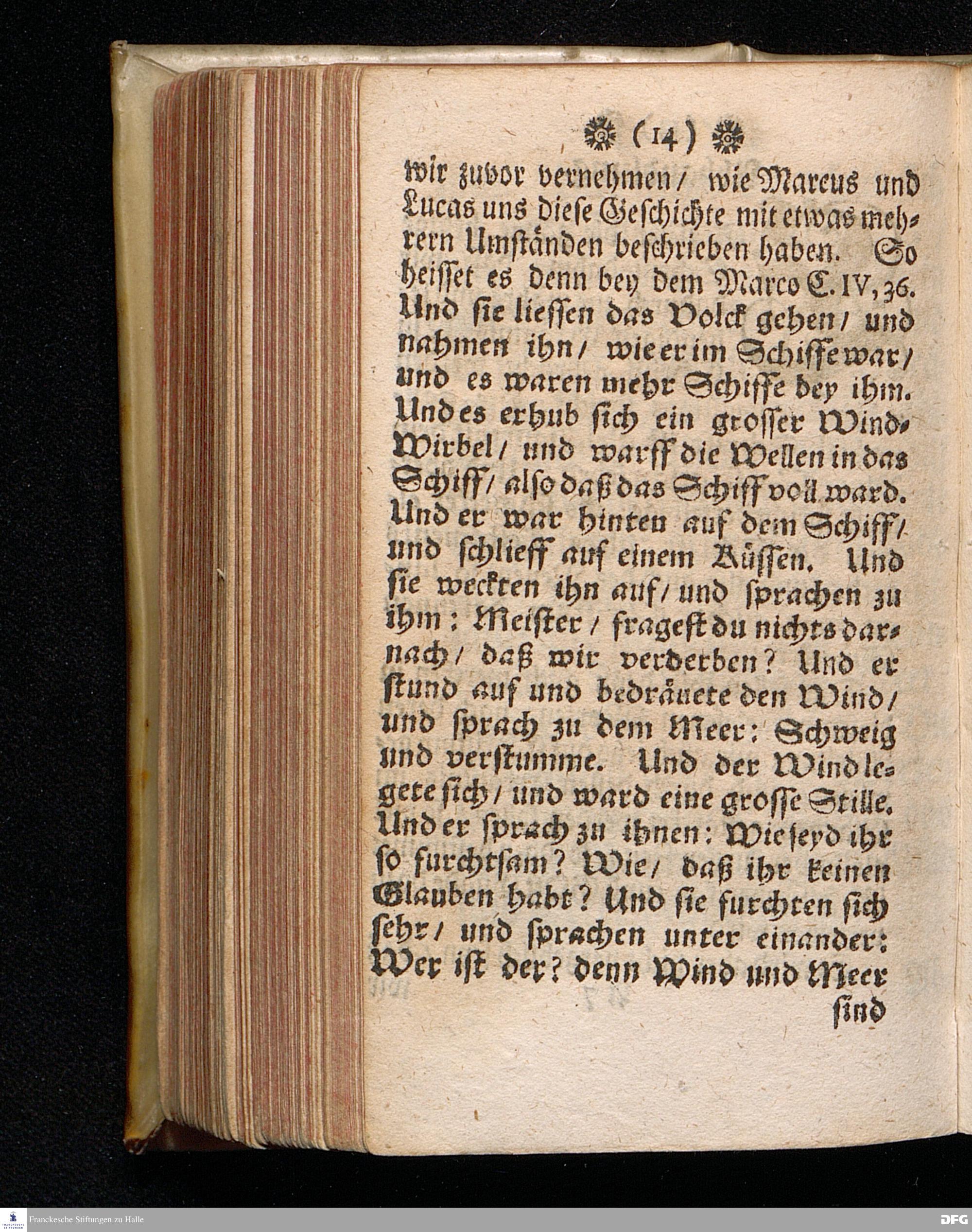 Reitzung zum Völligen Glauben Durch Vorstellung der Herrlichkeit JESU CHRISTI / Aus Der Historie von der Schiffarth CHristi / Matth.VIII, 23---27. In einem öffentlichen Vortrage Im Waysen=Hause zu Glaucha an Halle ertheilet / Und darauf zum Druck gegeben von August Hermann Francken / S.Theol.Prof.Ord.und Past.zu St.Ulrich und des Gymnasii Scholarcha. HALLE, in Verlegung des Wäysen=Hauses, 1715.