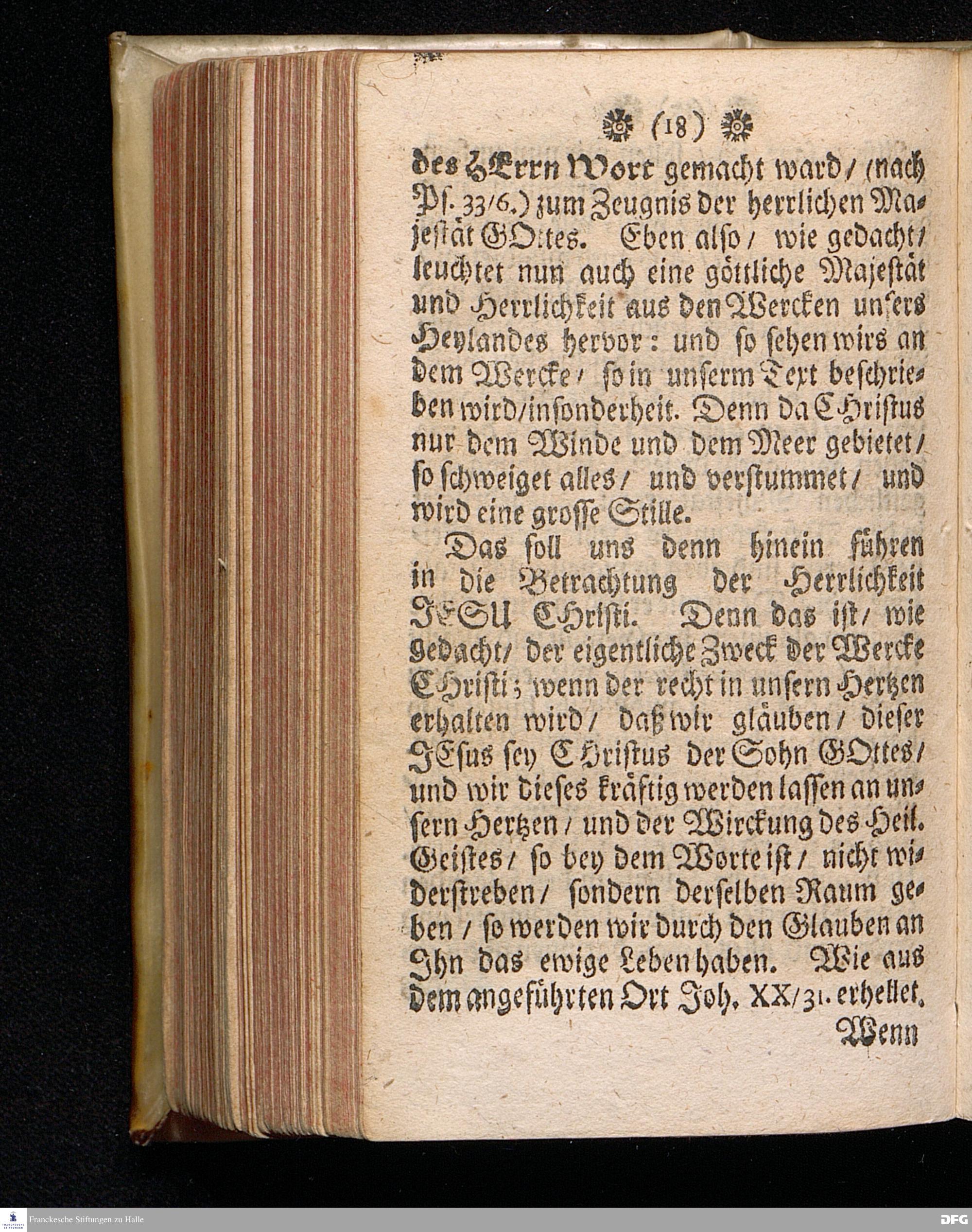 Reitzung zum Völligen Glauben Durch Vorstellung der Herrlichkeit JESU CHRISTI / Aus Der Historie von der Schiffarth CHristi / Matth.VIII, 23---27. In einem öffentlichen Vortrage Im Waysen=Hause zu Glaucha an Halle ertheilet / Und darauf zum Druck gegeben von August Hermann Francken / S.Theol.Prof.Ord.und Past.zu St.Ulrich und des Gymnasii Scholarcha. HALLE, in Verlegung des Wäysen=Hauses, 1715.