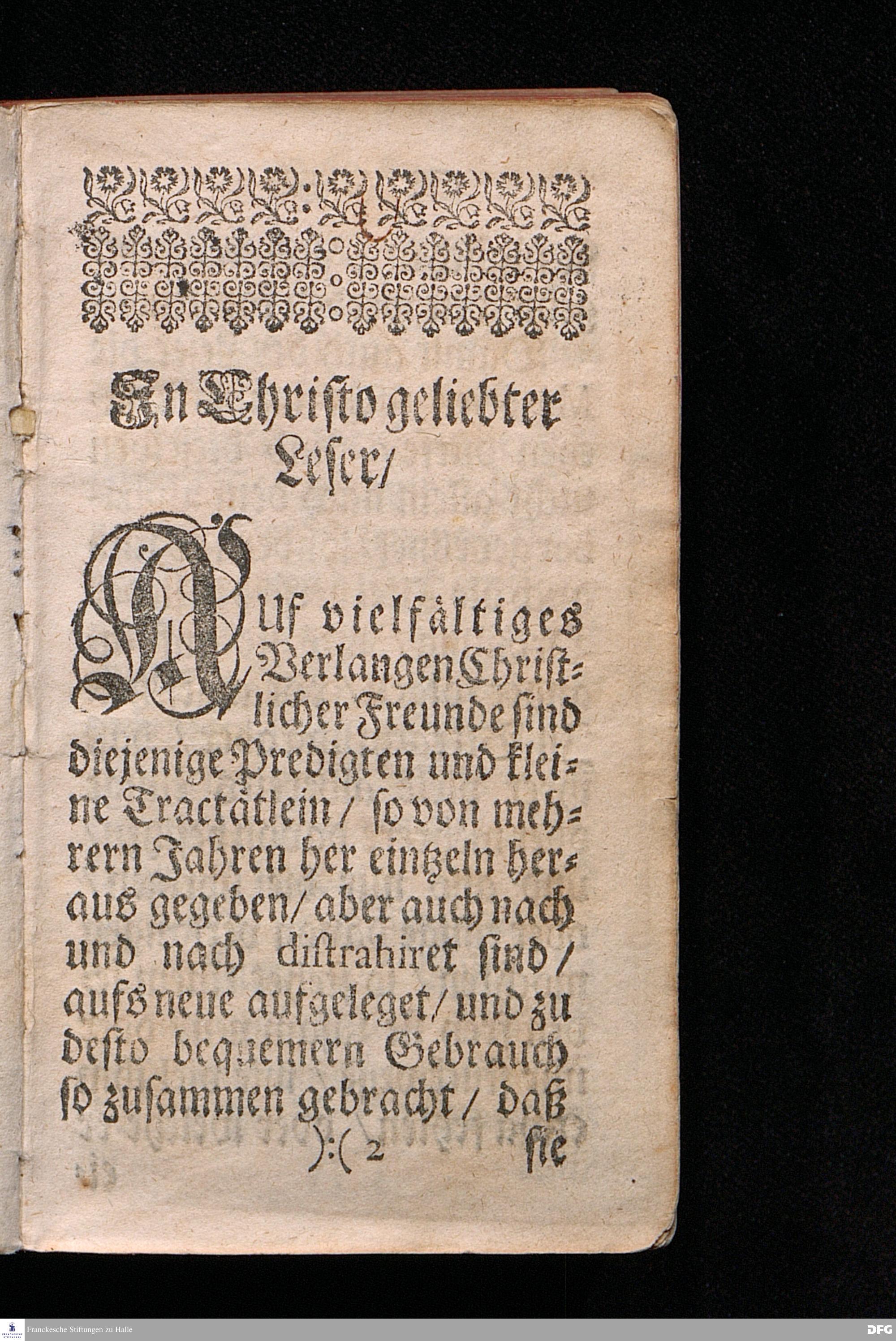 August Hermann Franckens / S.Theol.Prof.Ordin.Past.Vlr.& Scholarchæ, Predigten und Tractätlein / Welche Bis anhero eintzeln heraus gegeben, und nun auf vieler Christlichen Freunde öfters Begehren zusammen gedruckt sind. Erster Band. A - E. HALLE, in Verleg.des Wäysen=Hauses. MDCCXXIII.