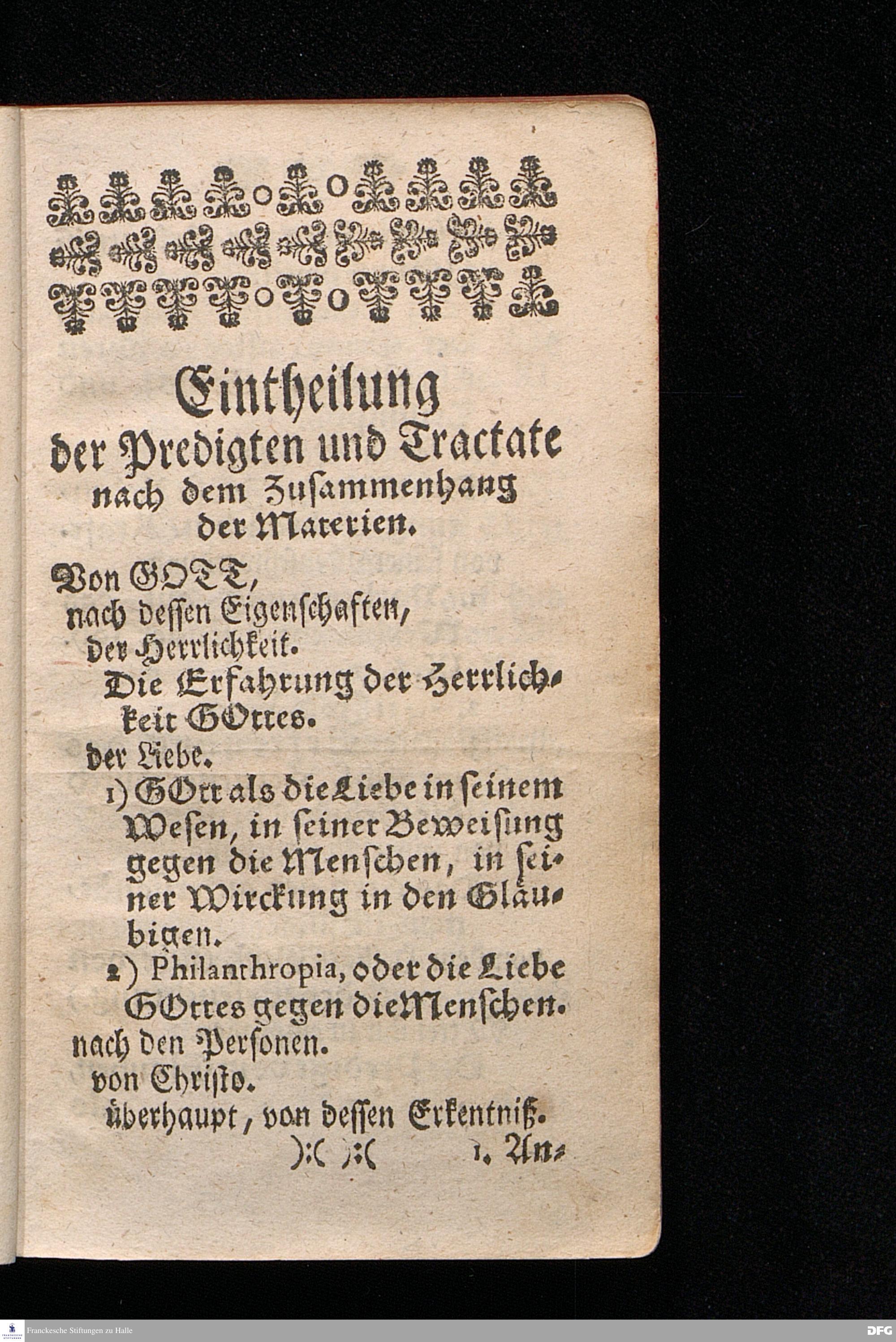 August Hermann Franckens / S.Theol.Prof.Ordin.Past.Vlr.& Scholarchæ, Predigten und Tractätlein / Welche Bis anhero eintzeln heraus gegeben, und nun auf vieler Christlichen Freunde öfters Begehren zusammen gedruckt sind. Erster Band. A - E. HALLE, in Verleg.des Wäysen=Hauses. MDCCXXIII.