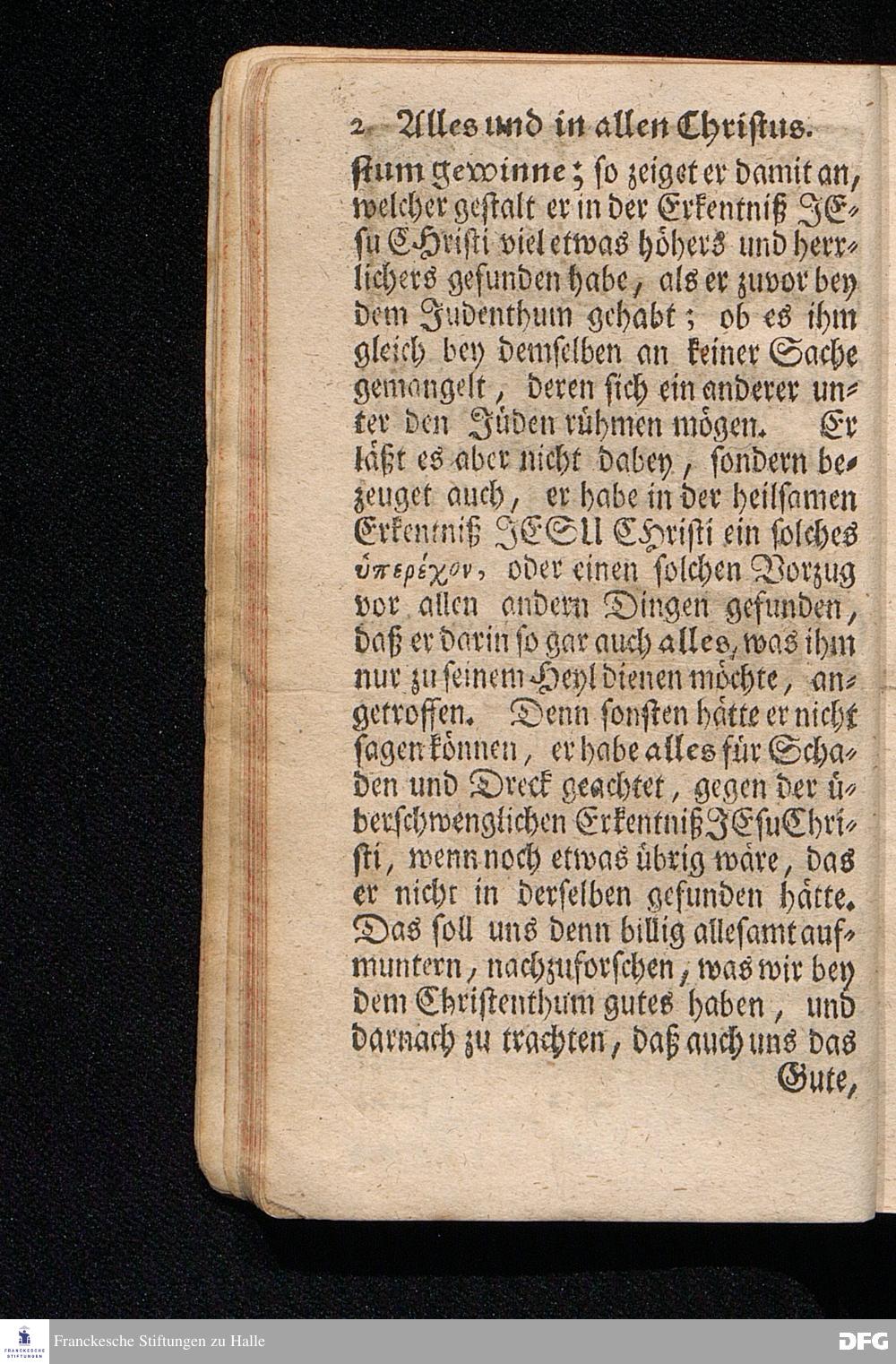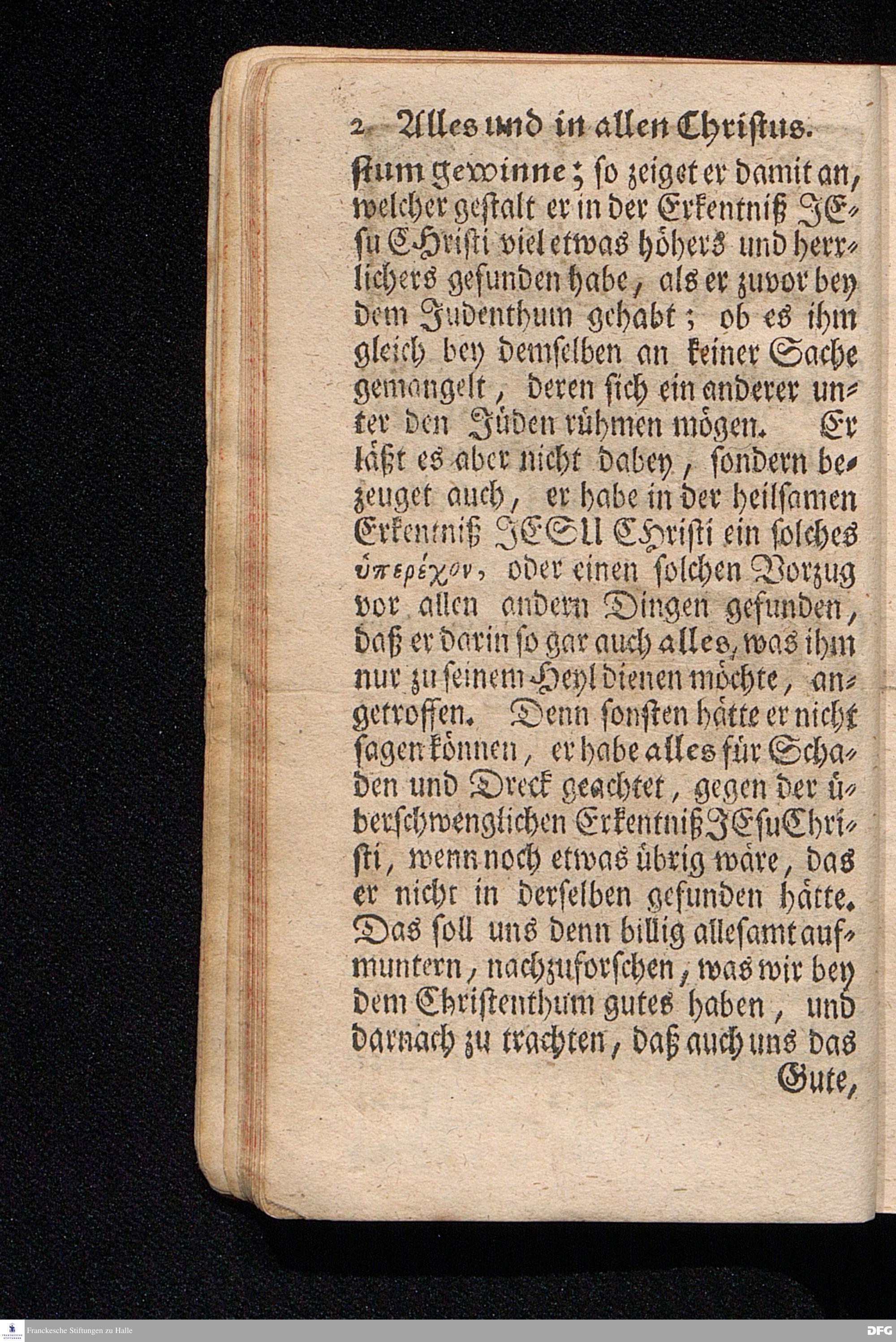 Alles Und In allen Christus / Aus dem Evangelischen Text Luc.I, 39--56. Am Fest der Heimsuchung Mariä 1714. In der Stadt Cönnern im Hertzogthum Magdeburg / In öffentlicher Predigt vorgestellet von August Hermann Francken / S.Theol.Prof.Past.Ulr.& Scholarch. EDITIO II. Der Jugend in den Schulen des Wäysenhauses nach gehaltenem Examine ausgetheilet den 25.Julii MDCCXXII. HALLE, In Verlegung des Wäysenhauses, MDCCXXII.