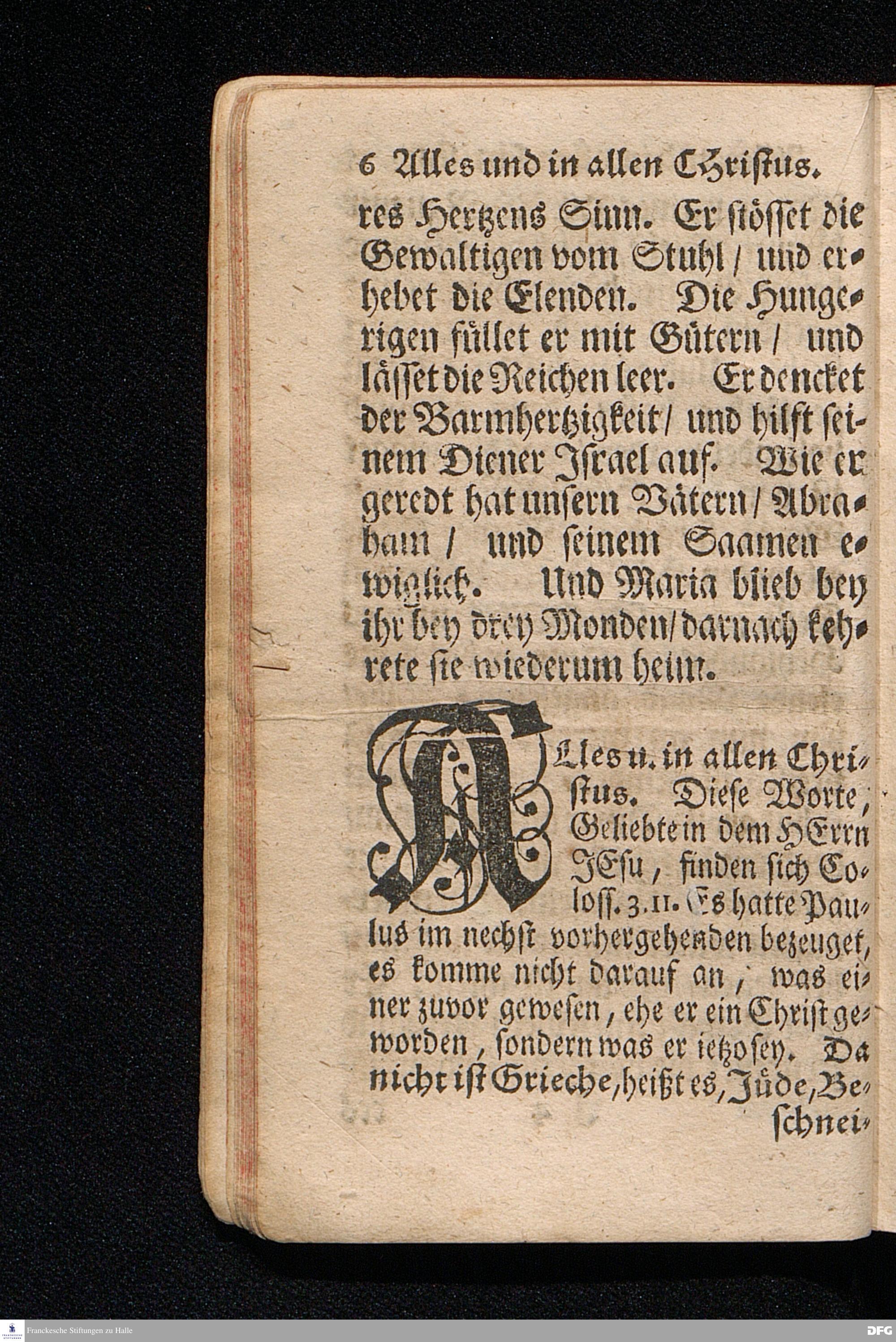 Alles Und In allen Christus / Aus dem Evangelischen Text Luc.I, 39--56. Am Fest der Heimsuchung Mariä 1714. In der Stadt Cönnern im Hertzogthum Magdeburg / In öffentlicher Predigt vorgestellet von August Hermann Francken / S.Theol.Prof.Past.Ulr.& Scholarch. EDITIO II. Der Jugend in den Schulen des Wäysenhauses nach gehaltenem Examine ausgetheilet den 25.Julii MDCCXXII. HALLE, In Verlegung des Wäysenhauses, MDCCXXII.