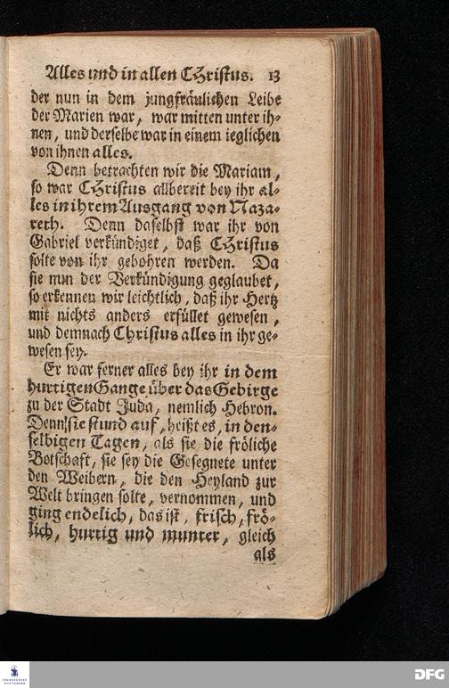 Alles Und In allen Christus / Aus dem Evangelischen Text Luc.I, 39--56. Am Fest der Heimsuchung Mariä 1714. In der Stadt Cönnern im Hertzogthum Magdeburg / In öffentlicher Predigt vorgestellet von August Hermann Francken / S.Theol.Prof.Past.Ulr.& Scholarch. EDITIO II. Der Jugend in den Schulen des Wäysenhauses nach gehaltenem Examine ausgetheilet den 25.Julii MDCCXXII. HALLE, In Verlegung des Wäysenhauses, MDCCXXII.