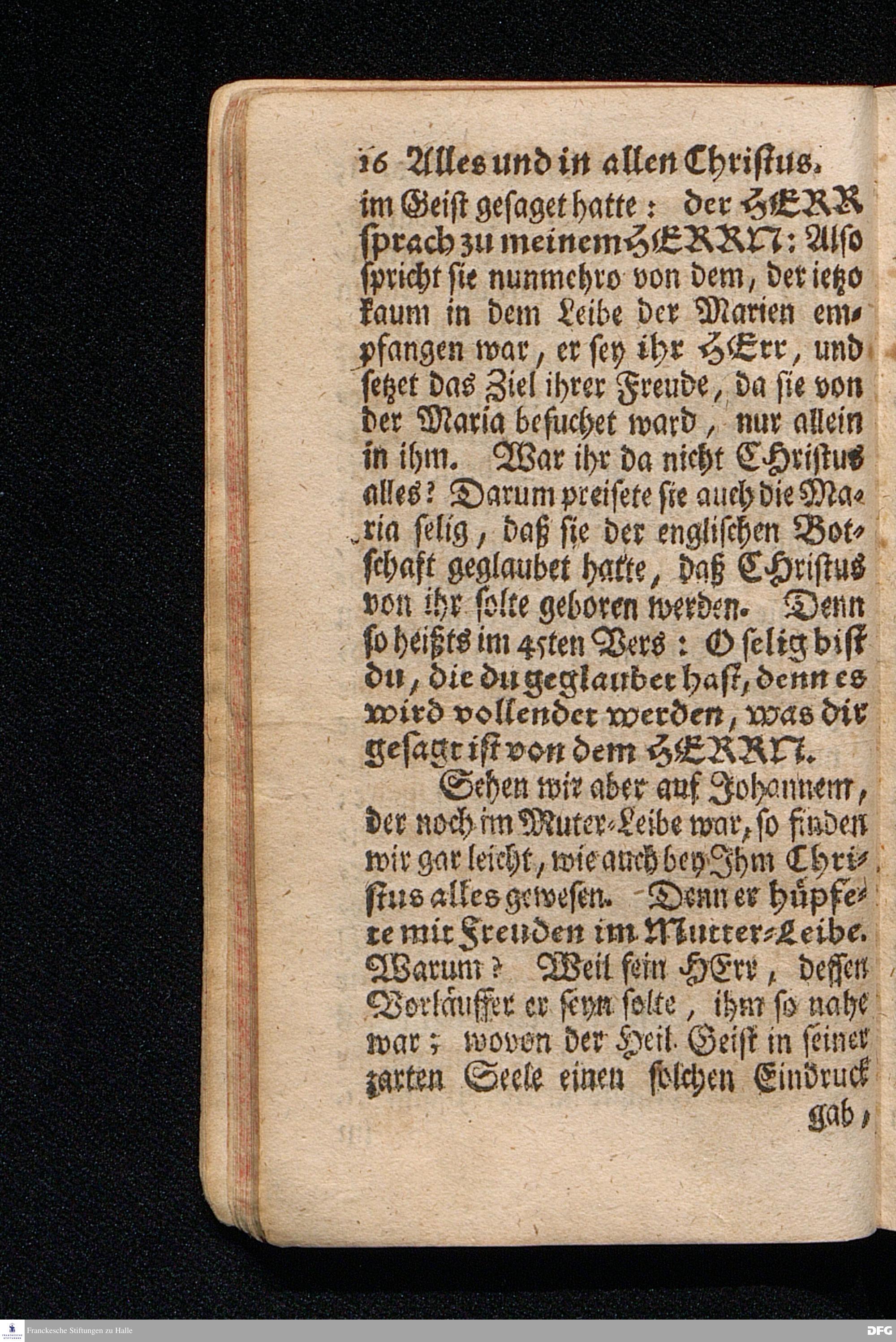 Alles Und In allen Christus / Aus dem Evangelischen Text Luc.I, 39--56. Am Fest der Heimsuchung Mariä 1714. In der Stadt Cönnern im Hertzogthum Magdeburg / In öffentlicher Predigt vorgestellet von August Hermann Francken / S.Theol.Prof.Past.Ulr.& Scholarch. EDITIO II. Der Jugend in den Schulen des Wäysenhauses nach gehaltenem Examine ausgetheilet den 25.Julii MDCCXXII. HALLE, In Verlegung des Wäysenhauses, MDCCXXII.
