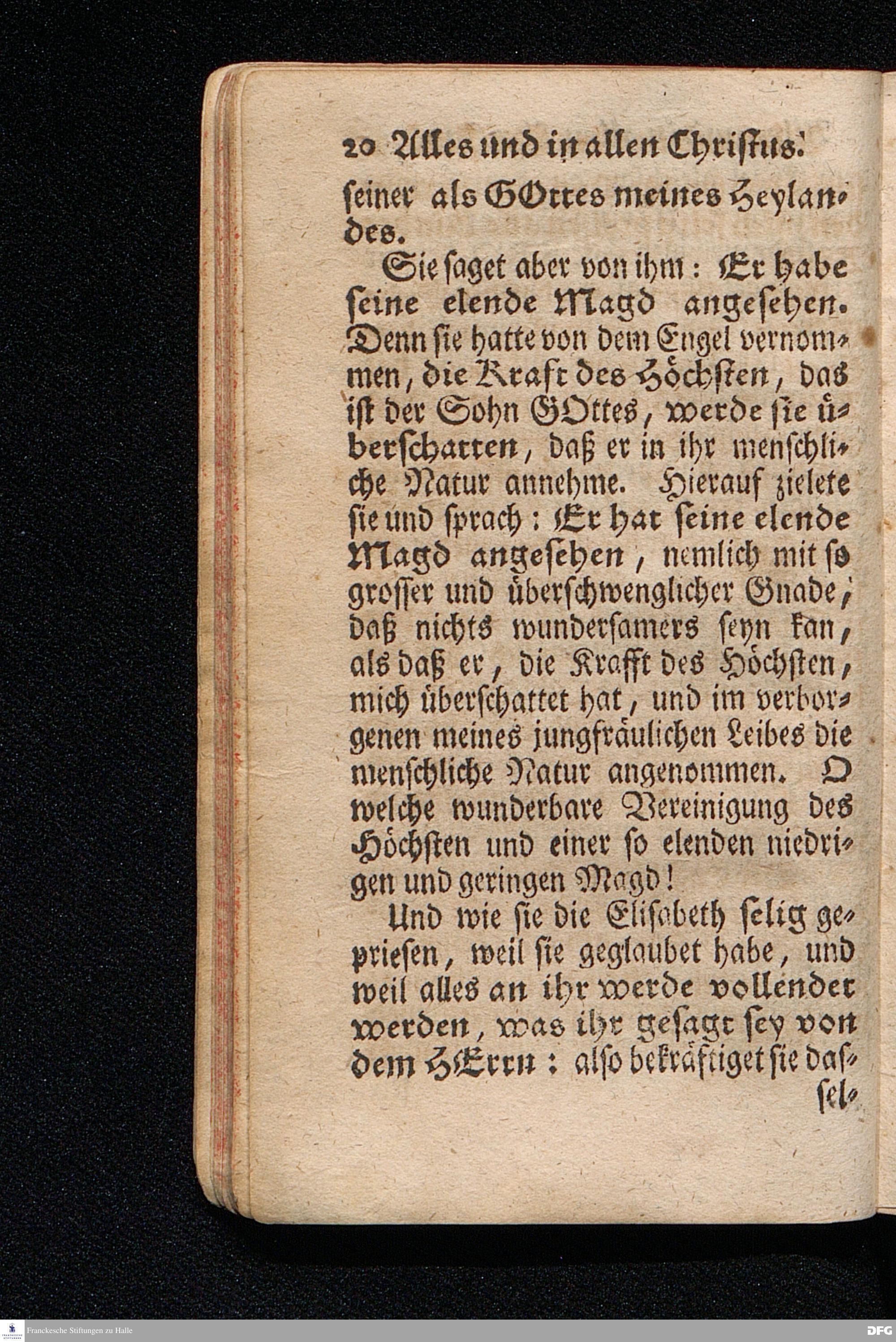 Alles Und In allen Christus / Aus dem Evangelischen Text Luc.I, 39--56. Am Fest der Heimsuchung Mariä 1714. In der Stadt Cönnern im Hertzogthum Magdeburg / In öffentlicher Predigt vorgestellet von August Hermann Francken / S.Theol.Prof.Past.Ulr.& Scholarch. EDITIO II. Der Jugend in den Schulen des Wäysenhauses nach gehaltenem Examine ausgetheilet den 25.Julii MDCCXXII. HALLE, In Verlegung des Wäysenhauses, MDCCXXII.