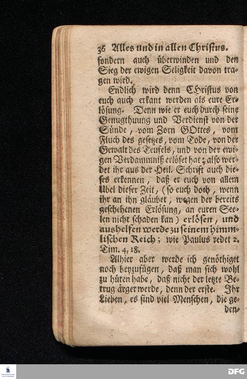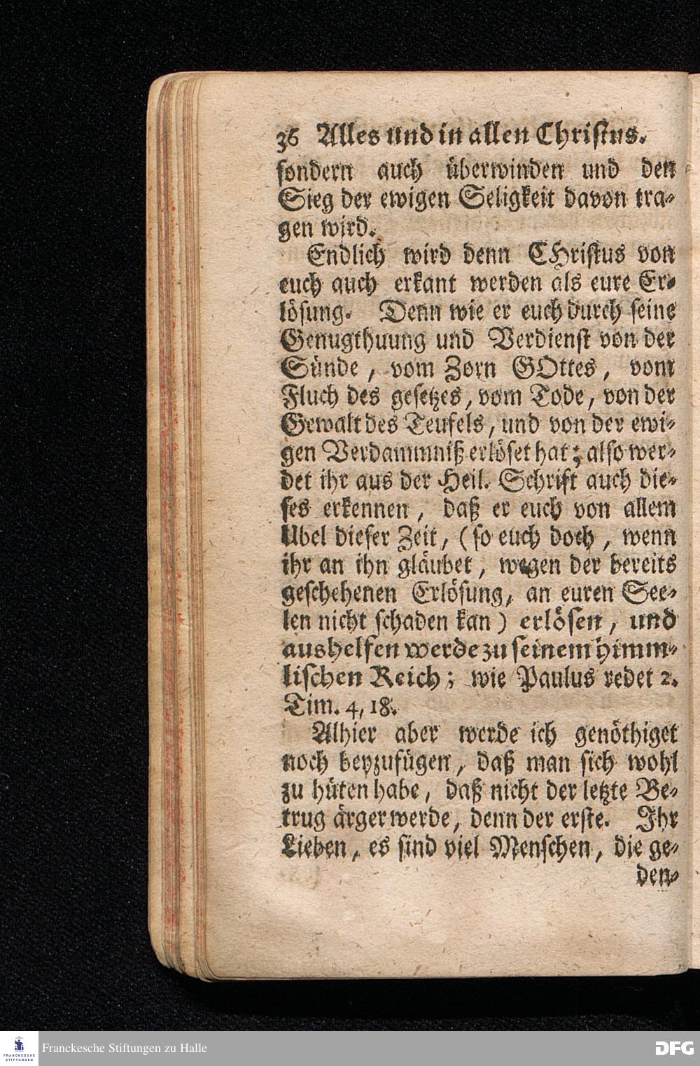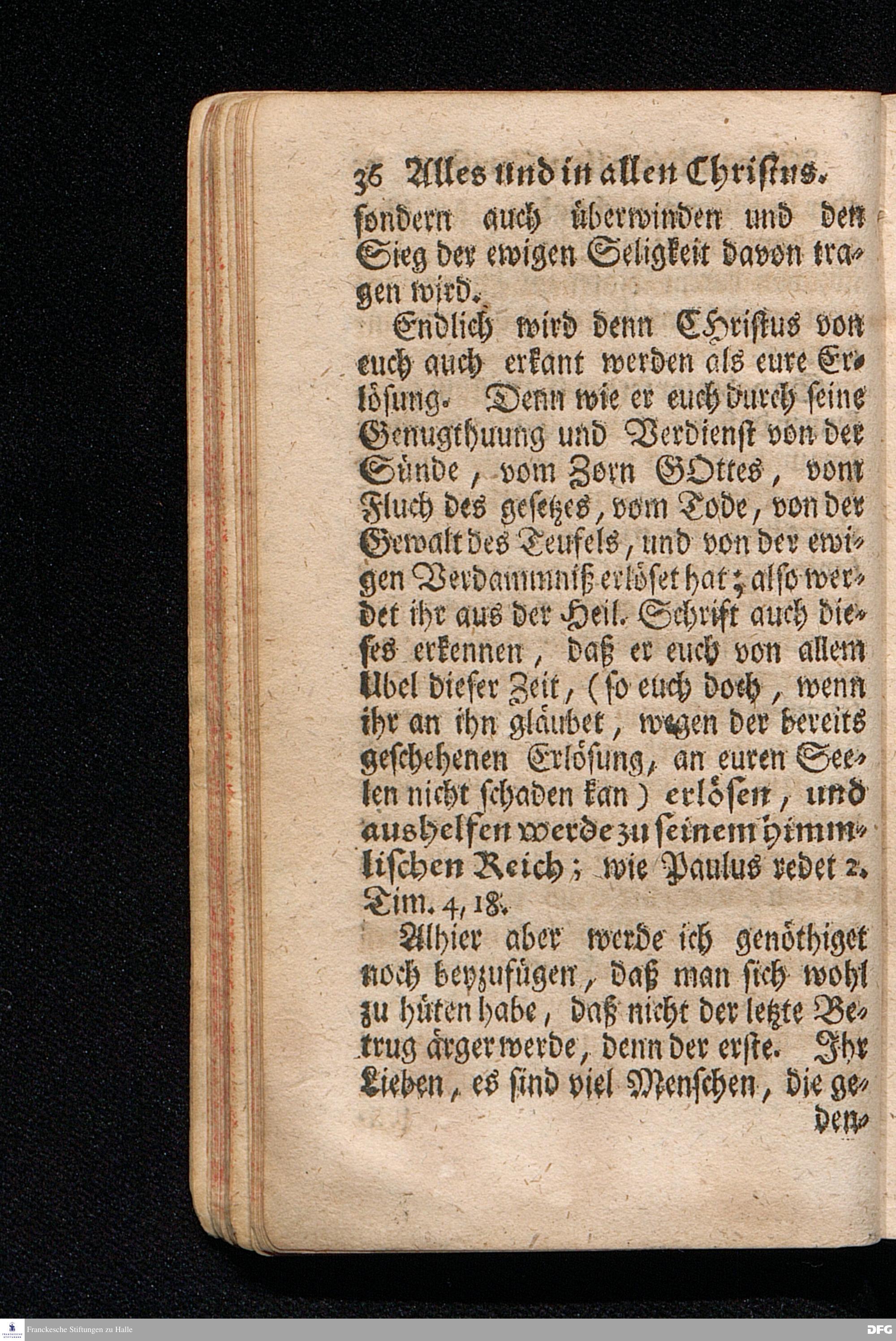 Alles Und In allen Christus / Aus dem Evangelischen Text Luc.I, 39--56. Am Fest der Heimsuchung Mariä 1714. In der Stadt Cönnern im Hertzogthum Magdeburg / In öffentlicher Predigt vorgestellet von August Hermann Francken / S.Theol.Prof.Past.Ulr.& Scholarch. EDITIO II. Der Jugend in den Schulen des Wäysenhauses nach gehaltenem Examine ausgetheilet den 25.Julii MDCCXXII. HALLE, In Verlegung des Wäysenhauses, MDCCXXII.