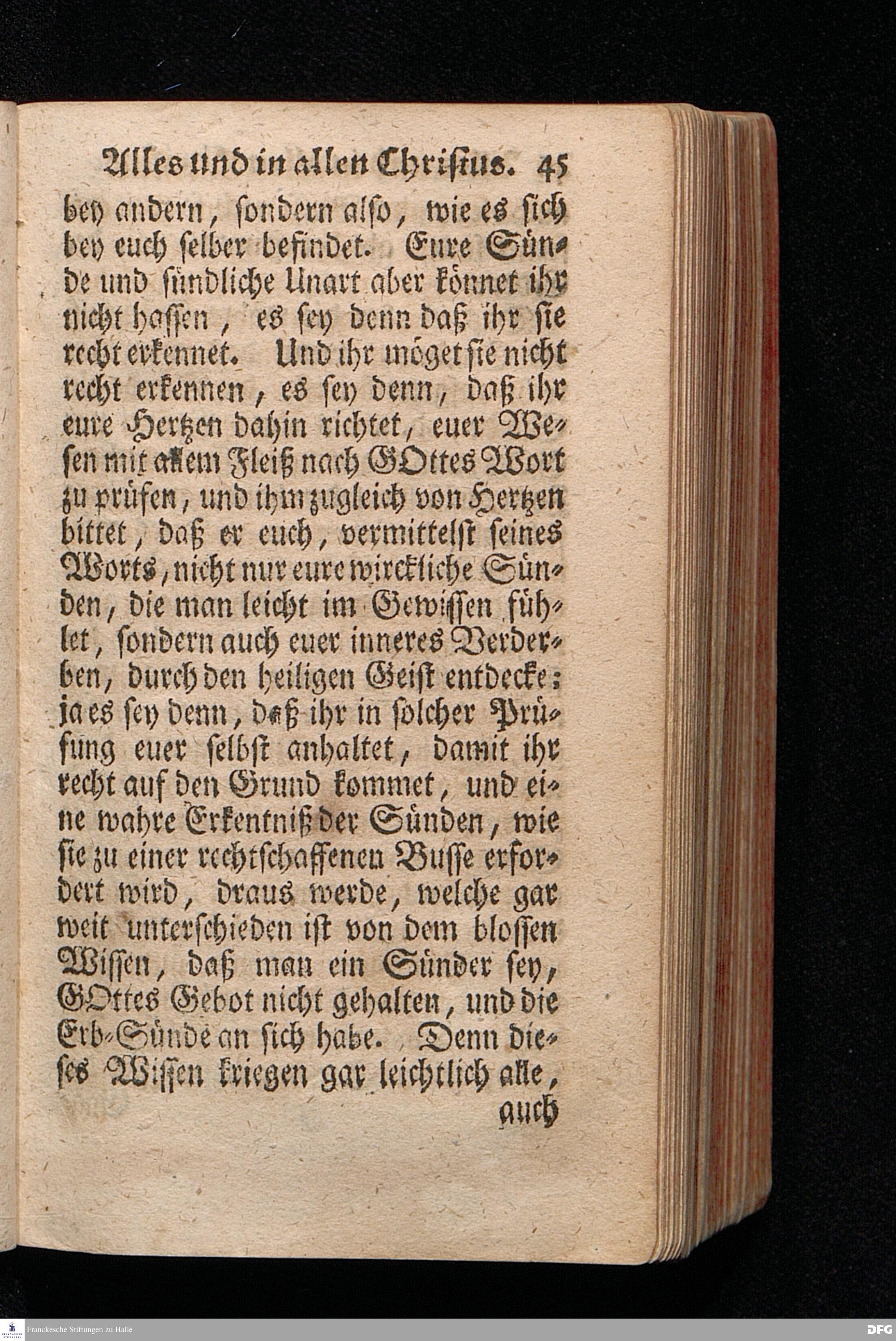 Alles Und In allen Christus / Aus dem Evangelischen Text Luc.I, 39--56. Am Fest der Heimsuchung Mariä 1714. In der Stadt Cönnern im Hertzogthum Magdeburg / In öffentlicher Predigt vorgestellet von August Hermann Francken / S.Theol.Prof.Past.Ulr.& Scholarch. EDITIO II. Der Jugend in den Schulen des Wäysenhauses nach gehaltenem Examine ausgetheilet den 25.Julii MDCCXXII. HALLE, In Verlegung des Wäysenhauses, MDCCXXII.