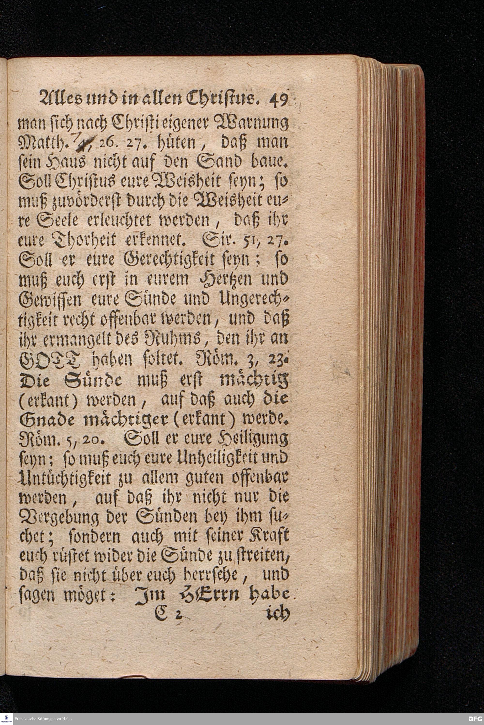 Alles Und In allen Christus / Aus dem Evangelischen Text Luc.I, 39--56. Am Fest der Heimsuchung Mariä 1714. In der Stadt Cönnern im Hertzogthum Magdeburg / In öffentlicher Predigt vorgestellet von August Hermann Francken / S.Theol.Prof.Past.Ulr.& Scholarch. EDITIO II. Der Jugend in den Schulen des Wäysenhauses nach gehaltenem Examine ausgetheilet den 25.Julii MDCCXXII. HALLE, In Verlegung des Wäysenhauses, MDCCXXII.