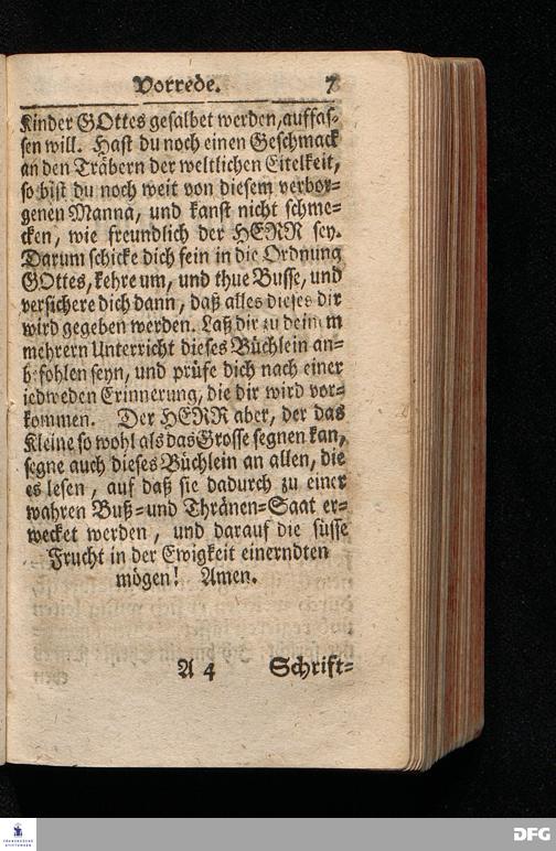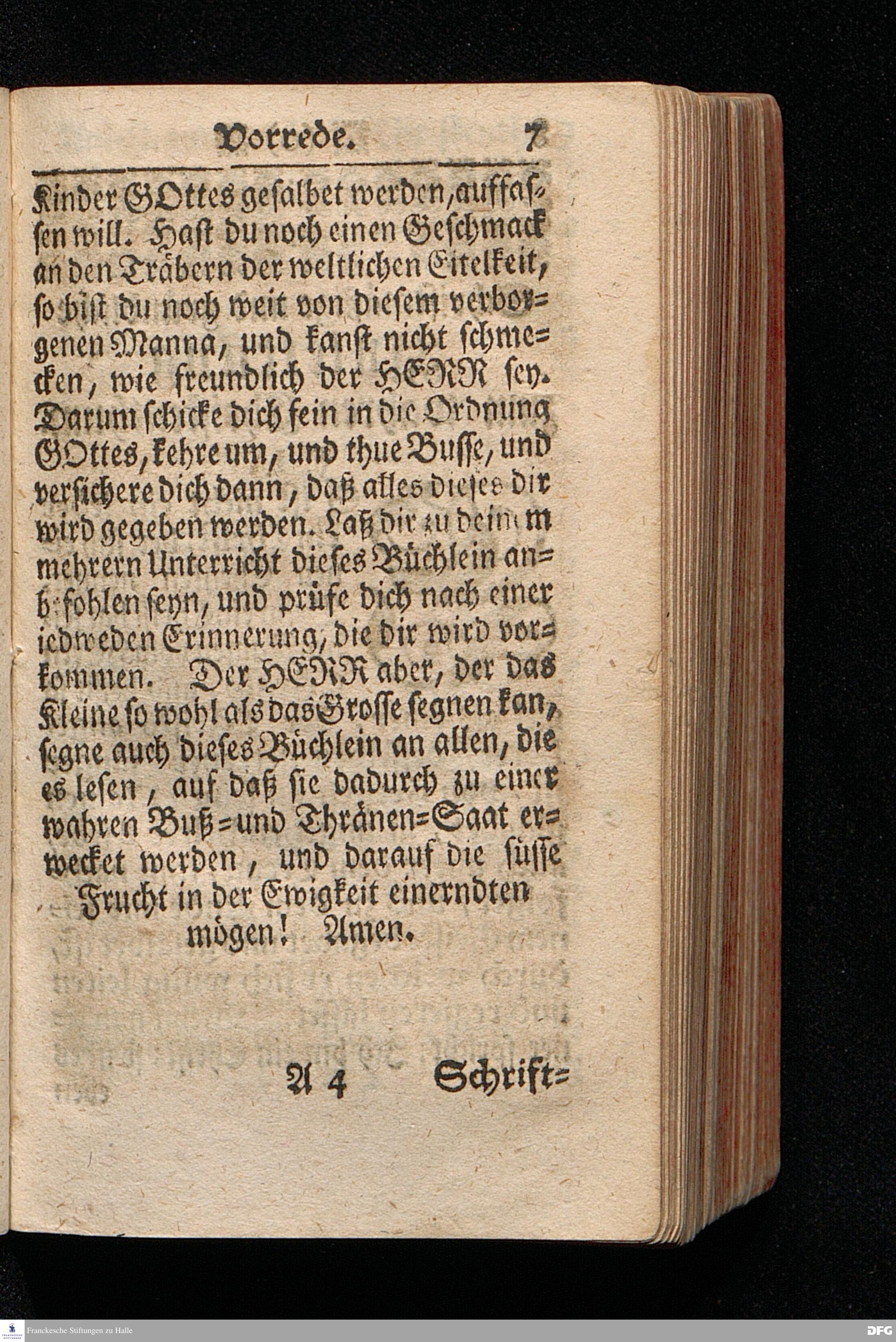 Die Lehre Vom Anfang Christliches Lebens / Bestehend in vier Theilen: I. In einer gründlichen Anleitung zu wahrer Busse und Glauben an GOTT. II. In einem einfältigen Unterricht, wie man die H.Schrift zu seiner wahren Erbauung lesen solle. III. In einer Schriftmäßigen Anweisung recht und GOTT gefällig zu beten. IV. In einer kurtzen Prüfung / ob man den wahren lebendigen Glauben an CHristum habe oder nicht. Die XIII.Auflage. HALLE, In Verlegung des Wäysenhauses, 1730.