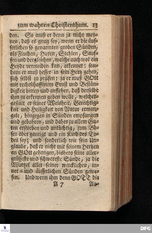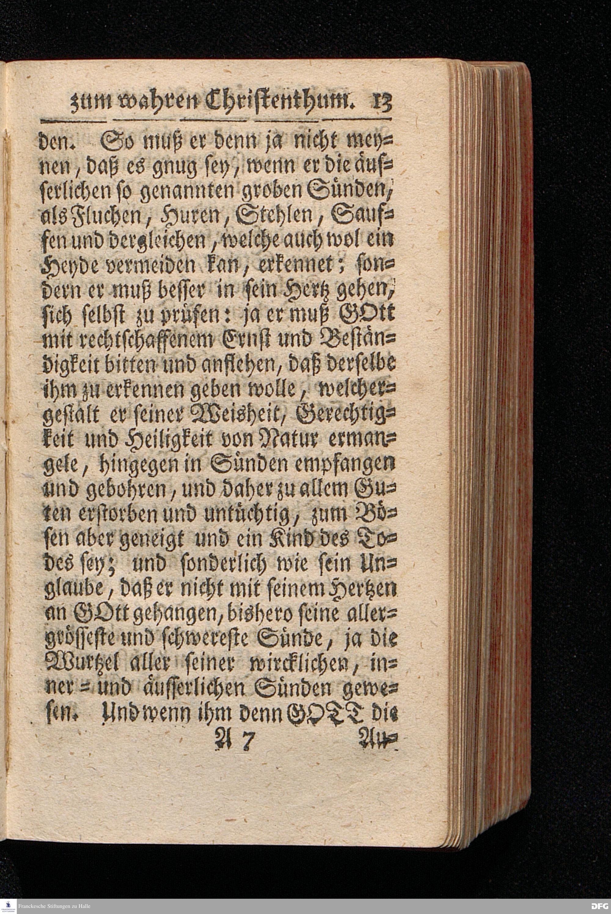 Die Lehre Vom Anfang Christliches Lebens / Bestehend in vier Theilen: I. In einer gründlichen Anleitung zu wahrer Busse und Glauben an GOTT. II. In einem einfältigen Unterricht, wie man die H.Schrift zu seiner wahren Erbauung lesen solle. III. In einer Schriftmäßigen Anweisung recht und GOTT gefällig zu beten. IV. In einer kurtzen Prüfung / ob man den wahren lebendigen Glauben an CHristum habe oder nicht. Die XIII.Auflage. HALLE, In Verlegung des Wäysenhauses, 1730.