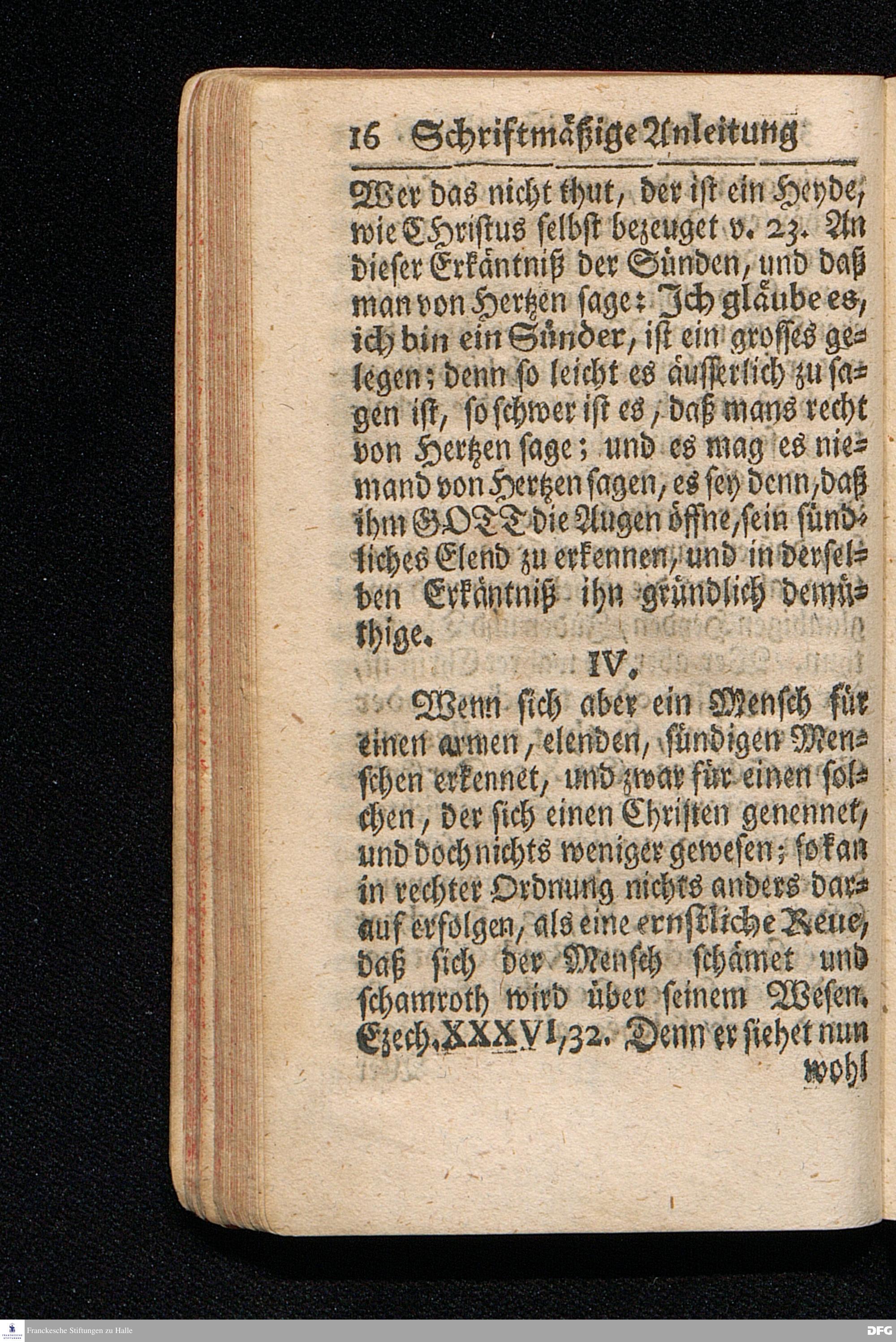 Die Lehre Vom Anfang Christliches Lebens / Bestehend in vier Theilen: I. In einer gründlichen Anleitung zu wahrer Busse und Glauben an GOTT. II. In einem einfältigen Unterricht, wie man die H.Schrift zu seiner wahren Erbauung lesen solle. III. In einer Schriftmäßigen Anweisung recht und GOTT gefällig zu beten. IV. In einer kurtzen Prüfung / ob man den wahren lebendigen Glauben an CHristum habe oder nicht. Die XIII.Auflage. HALLE, In Verlegung des Wäysenhauses, 1730.