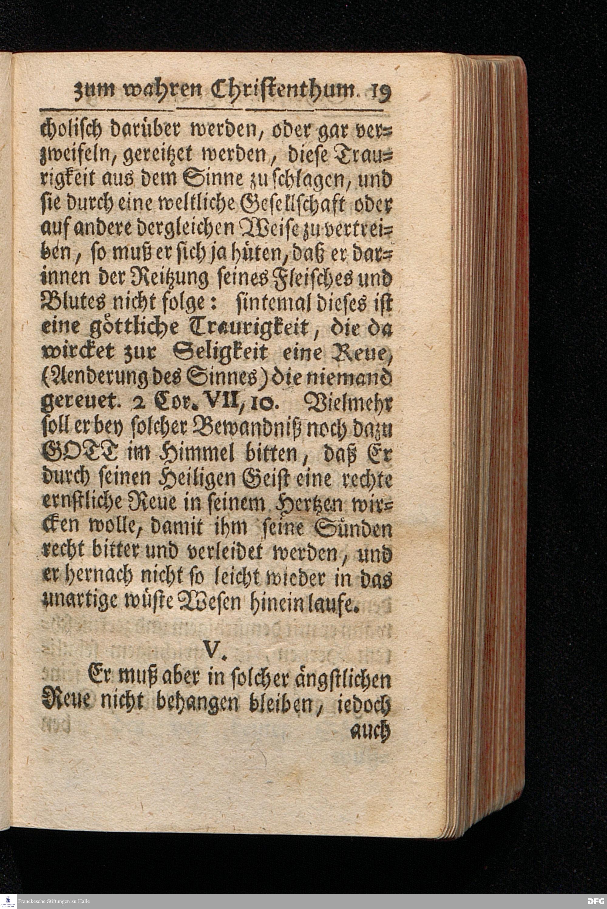 Die Lehre Vom Anfang Christliches Lebens / Bestehend in vier Theilen: I. In einer gründlichen Anleitung zu wahrer Busse und Glauben an GOTT. II. In einem einfältigen Unterricht, wie man die H.Schrift zu seiner wahren Erbauung lesen solle. III. In einer Schriftmäßigen Anweisung recht und GOTT gefällig zu beten. IV. In einer kurtzen Prüfung / ob man den wahren lebendigen Glauben an CHristum habe oder nicht. Die XIII.Auflage. HALLE, In Verlegung des Wäysenhauses, 1730.