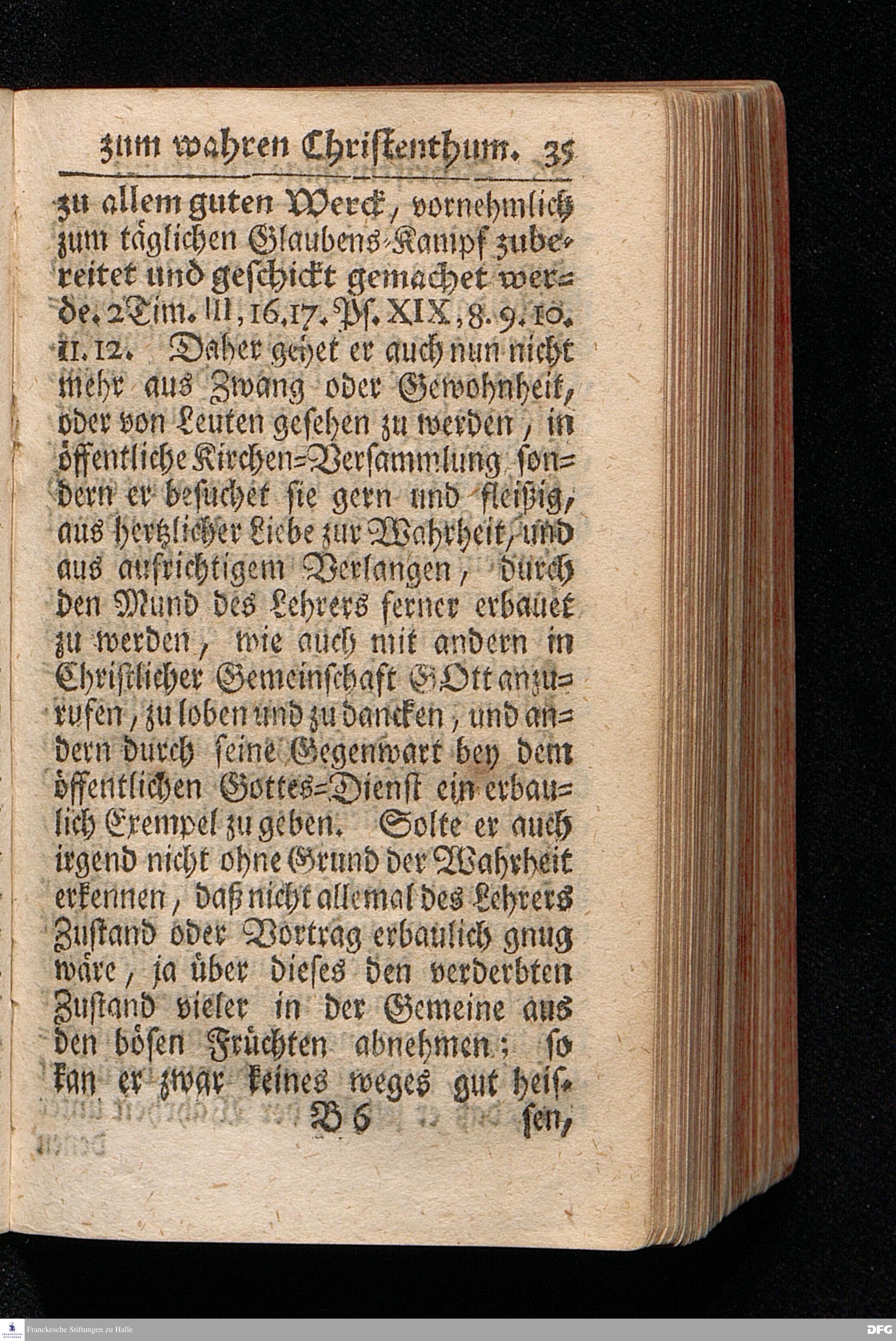 Die Lehre Vom Anfang Christliches Lebens / Bestehend in vier Theilen: I. In einer gründlichen Anleitung zu wahrer Busse und Glauben an GOTT. II. In einem einfältigen Unterricht, wie man die H.Schrift zu seiner wahren Erbauung lesen solle. III. In einer Schriftmäßigen Anweisung recht und GOTT gefällig zu beten. IV. In einer kurtzen Prüfung / ob man den wahren lebendigen Glauben an CHristum habe oder nicht. Die XIII.Auflage. HALLE, In Verlegung des Wäysenhauses, 1730.