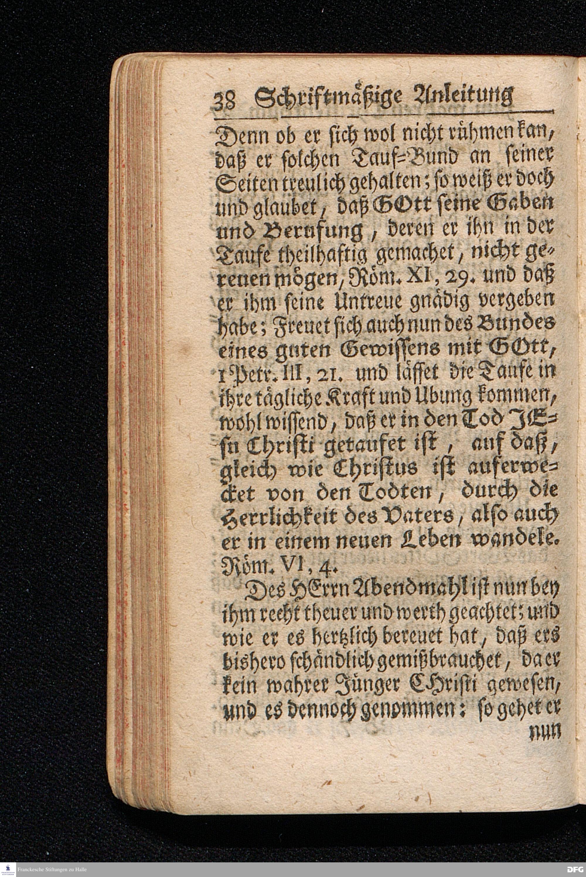 Die Lehre Vom Anfang Christliches Lebens / Bestehend in vier Theilen: I. In einer gründlichen Anleitung zu wahrer Busse und Glauben an GOTT. II. In einem einfältigen Unterricht, wie man die H.Schrift zu seiner wahren Erbauung lesen solle. III. In einer Schriftmäßigen Anweisung recht und GOTT gefällig zu beten. IV. In einer kurtzen Prüfung / ob man den wahren lebendigen Glauben an CHristum habe oder nicht. Die XIII.Auflage. HALLE, In Verlegung des Wäysenhauses, 1730.